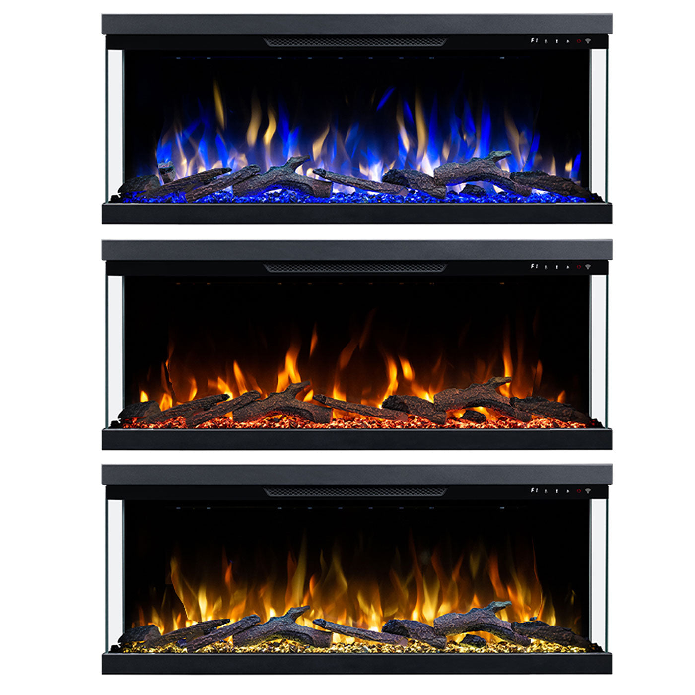 Experience stunning panoramic flames with the Aspen 3-sided electric fireplace. Its tall, modern design offers multiple viewing angles and smart control via Tuya app, remote, or touch panel. Packed with premium features including customizable flame colours, sound effects, and versatile heating options, perfect for creating a luxurious focal point in any space.