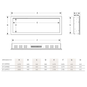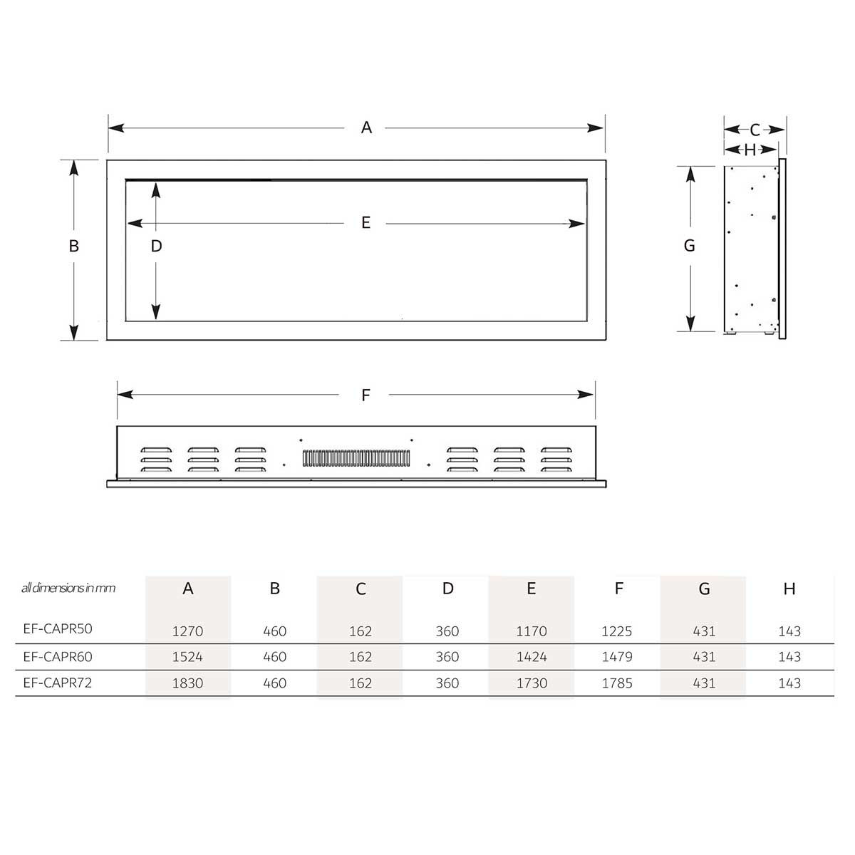 • Designed with front flow heating with hidden venting, The venting is located at the top of the unit allowing heat to cascade down in front of the glass.