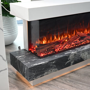 The Cascade 1600W 3-Sided Electric Fireplace Marble Suite combines luxury with modern design. This stunning fireplace features a unique two-tone marble design, with a sleek white stone top and a natural stone base that showcases one-of-a-kind textures. The natural stone below enhances the aesthetic appeal, displaying intricate patterns and an earthy elegance that complements any room.