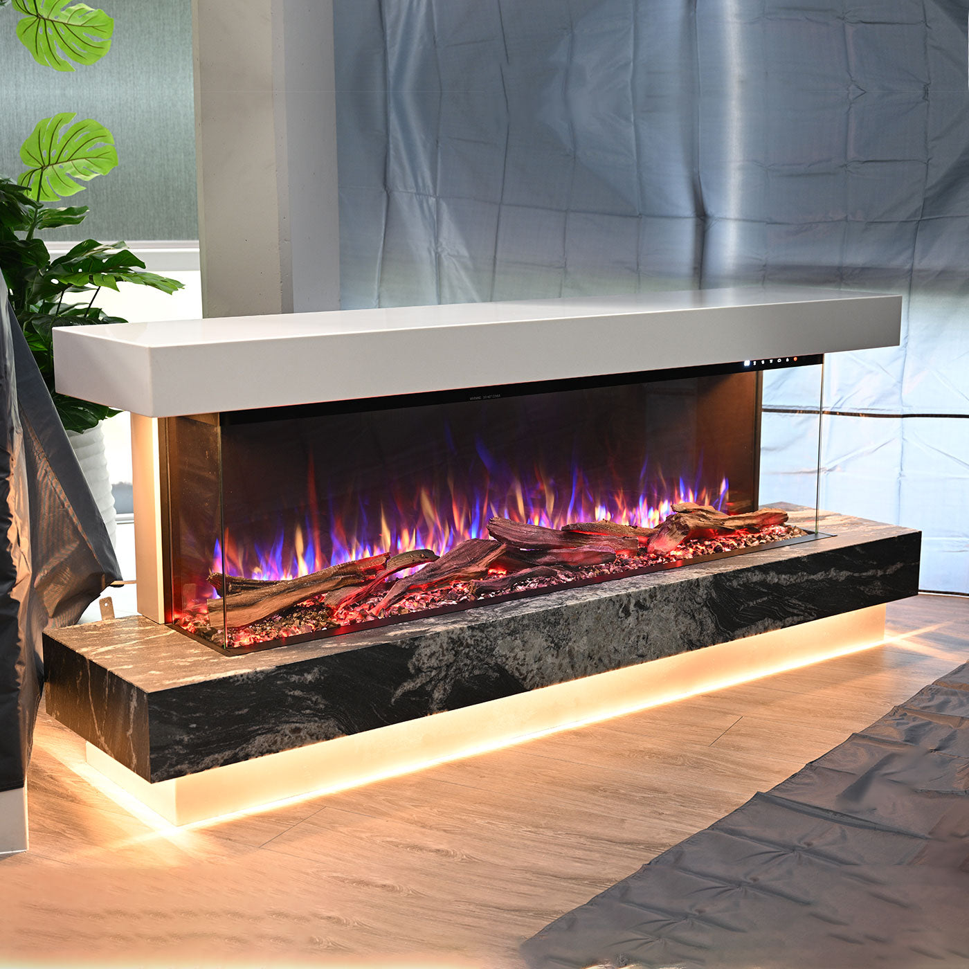 Designed with an extra-deep profile, the fireplace offers a panoramic 3-sided viewing experience, allowing the flames to be seen from the front, left, and right sides. This makes it an ideal centerpiece for open living spaces or lounges, combining both aesthetic beauty and superior functionality. Discreet LED lighting further highlights the marble base, creating an ambient glow that enhances the atmosphere.