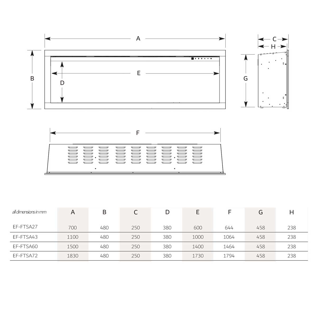 • Designed with front flow heating with hidden venting, The venting is located at the top of the unit allowing heat to cascade down in front of the glass.