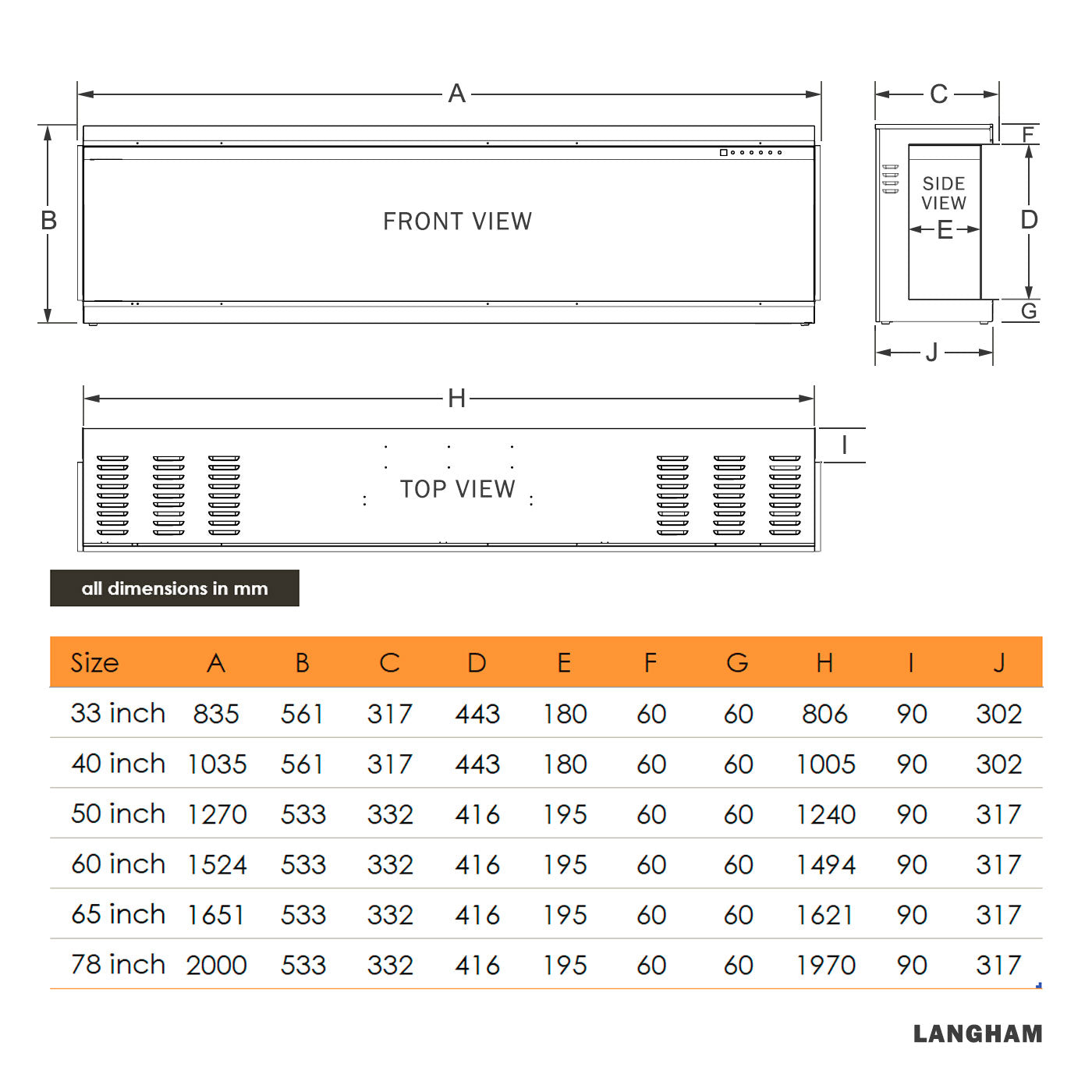 • Designed with front flow heating with hidden venting, The venting is located at the top of the unit allowing heat to cascade down in front of the glass.