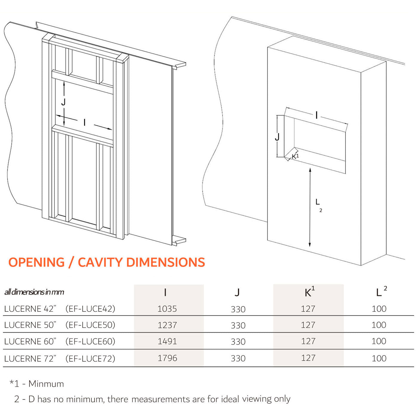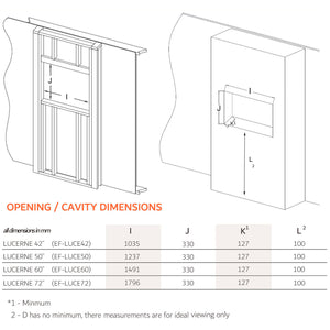 • Cavity Size (recessed): 123.7 cm (W) x 33.0 cm (H) x 12.7 cm (D) minimum depth