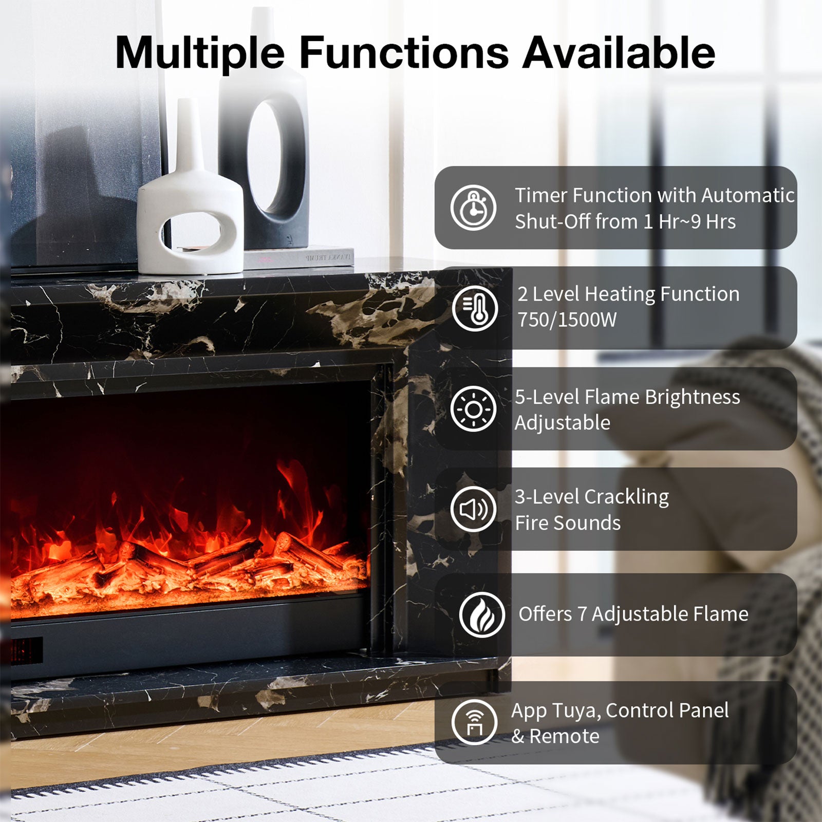 Home 40-69 Inch Marquess 60" Electric Fireplace with Black Marble Veneer Mantel Suite - Smartphone Control