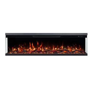 Stunning panoramic flames with 15 flame, fuel bed, and downlighting colours. Install recessed, wall mounted, or freestanding. Includes smoky crystals, Charwood Log Set, and smart control via app or remote.