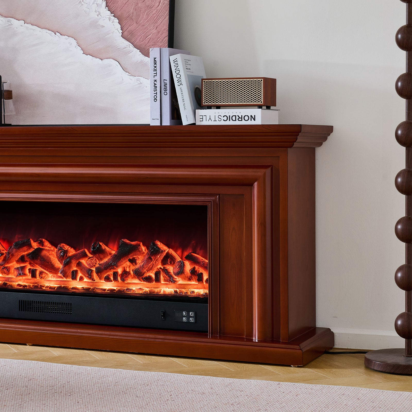 Wide mantel design: Low-profile layout with textured brown wood grain finish