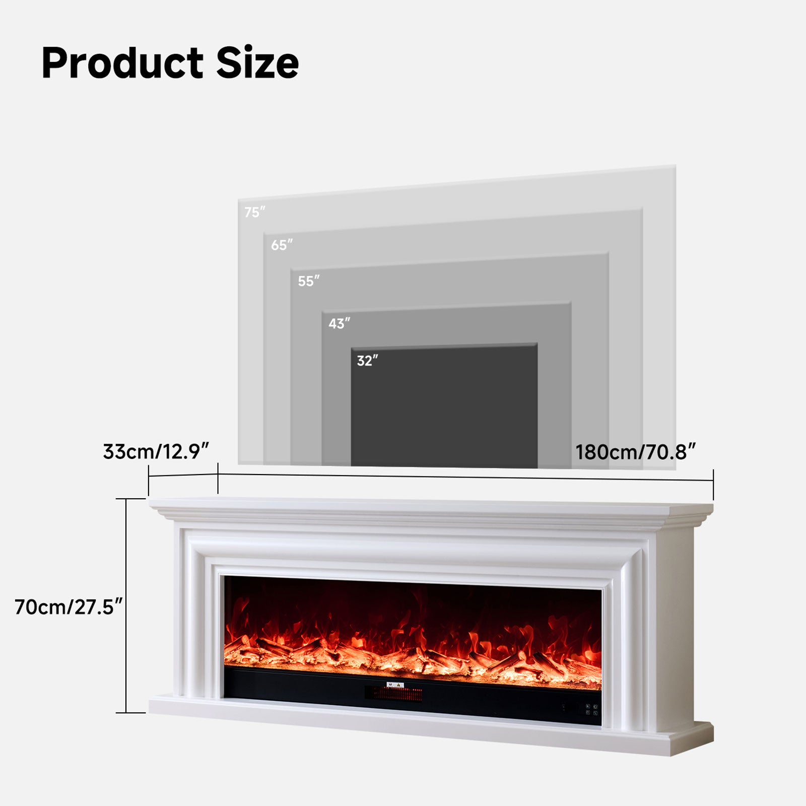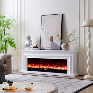 The Verona Electric Fireplace Heater Suite combines modern proportions with classic design, creating a statement piece for any living space. This wide 60-inch version features a sleek white mantel paired with the Orion Electric Fireplace Insert, delivering realistic flames, powerful warmth, and effortless smartphone control. Perfect for larger rooms, it brings elegance, comfort, and smart convenience together in one refined centerpiece.