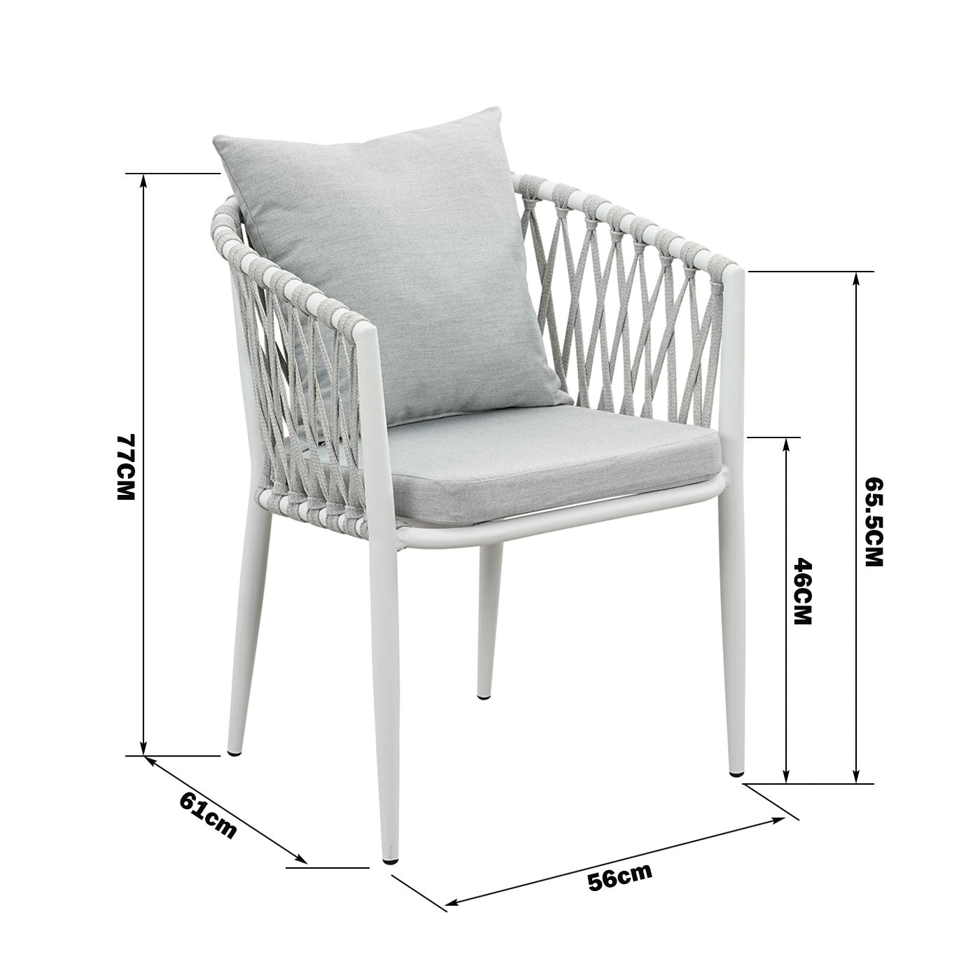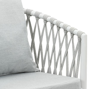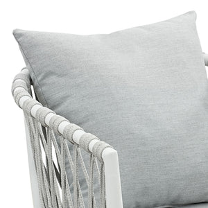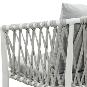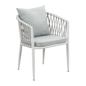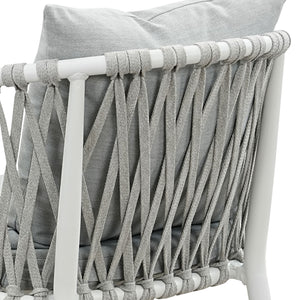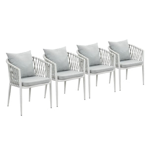 Set of 4 Mornington outdoor dining chairs featuring white aluminium frames with handwoven rope detailing and light grey cushions. Fully assembled with ergonomic armrests and weather-resistant materials. Includes seat and back cushions. 3-year structural warranty.