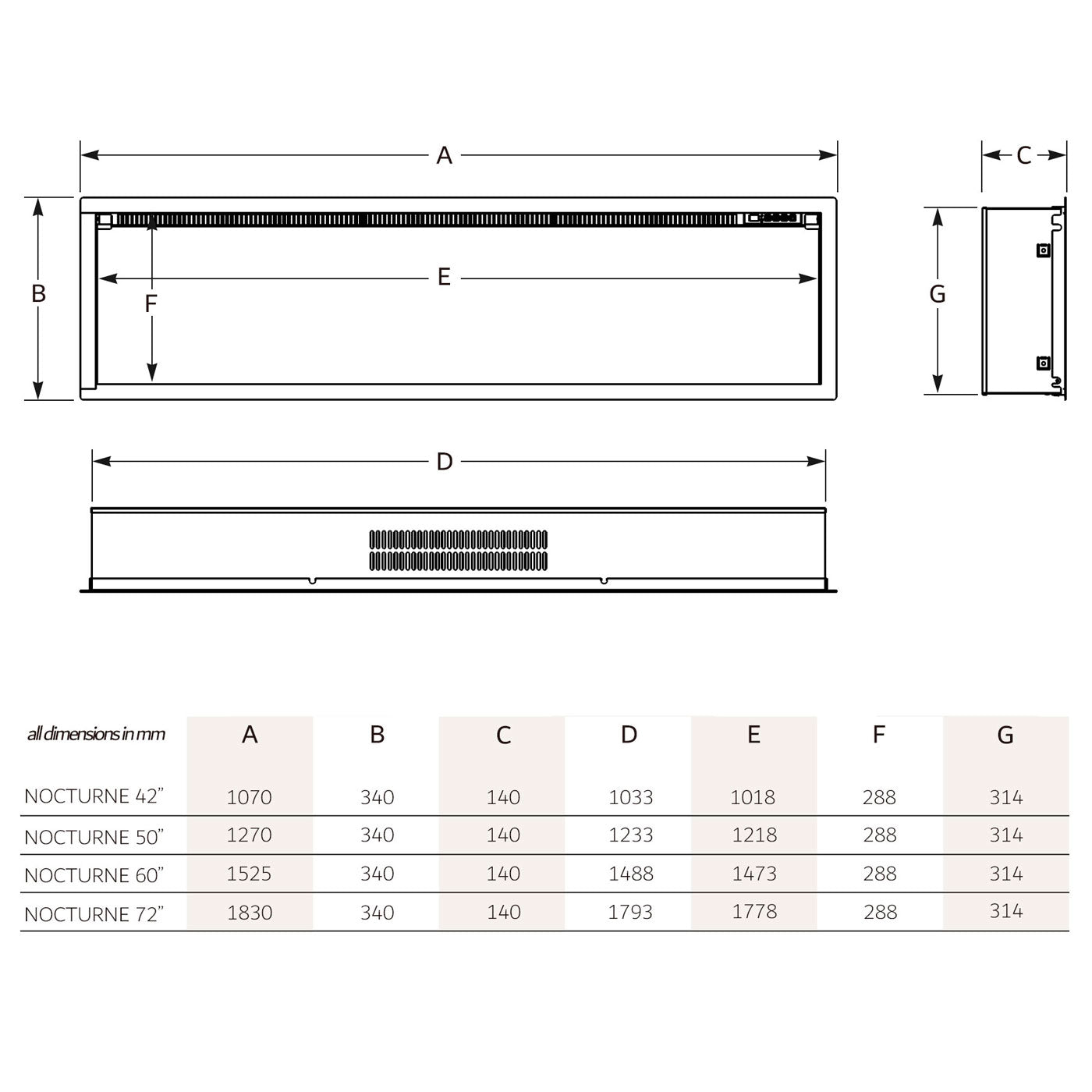 The Nocturne Electric Fireplace offers a sleek, ultra-slim design at just 34 cm in height, ideal for recessed installations beneath TVs. It provides a customizable experience with flame color options, adjustable brightness, and dual heating levels.