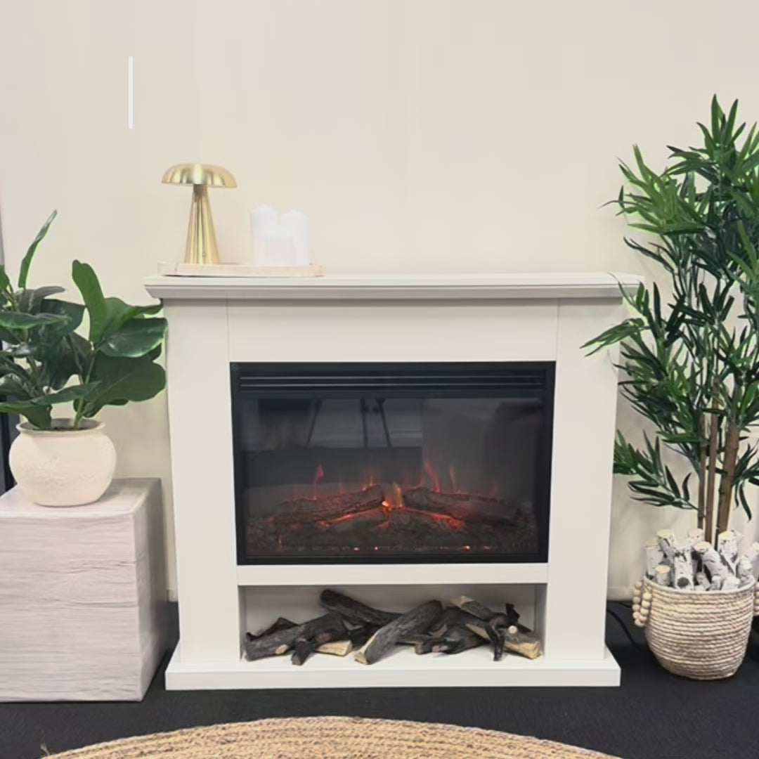 Bring modern sophistication and cozy comfort into your home with the Onyx Fireplace Suite, featuring a beautifully crafted white mantel with a practical built-in storage area and the ultra-realistic 27-inch Stella Electric Fireplace Insert. Perfect for creating a warm and inviting ambiance in any room.