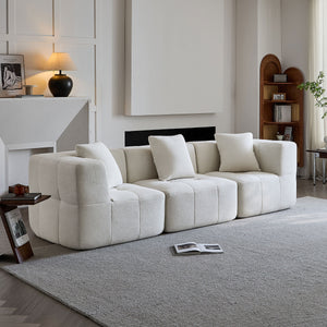 A sculptural 3-seater modular sofa made of all high-density foam and wrapped in soft beige flannel. Compression-packed and ready to lounge—no assembly required.