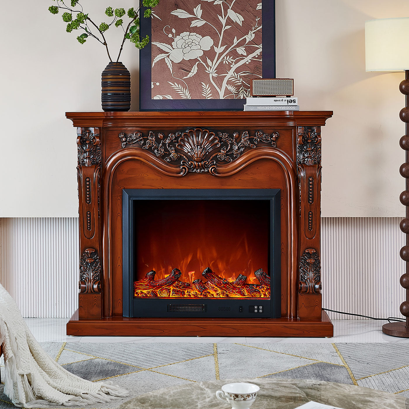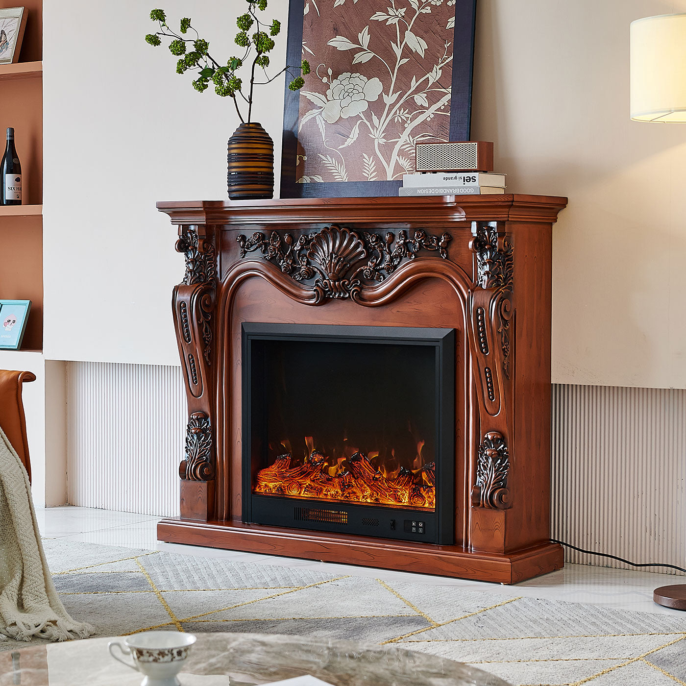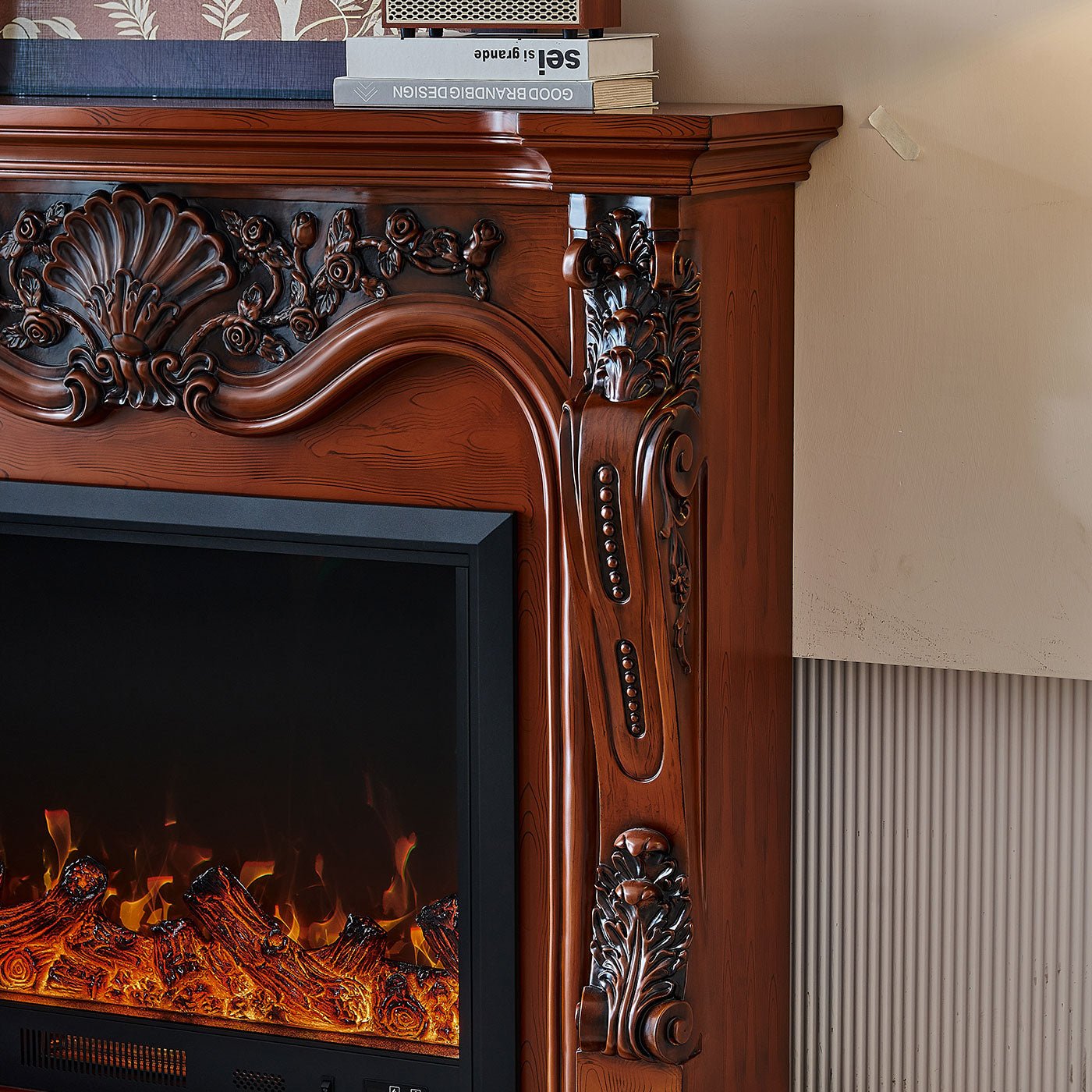 Elegant mantel design: The brown mantel with intricate carvings and wood grain texture adds a timeless focal point.