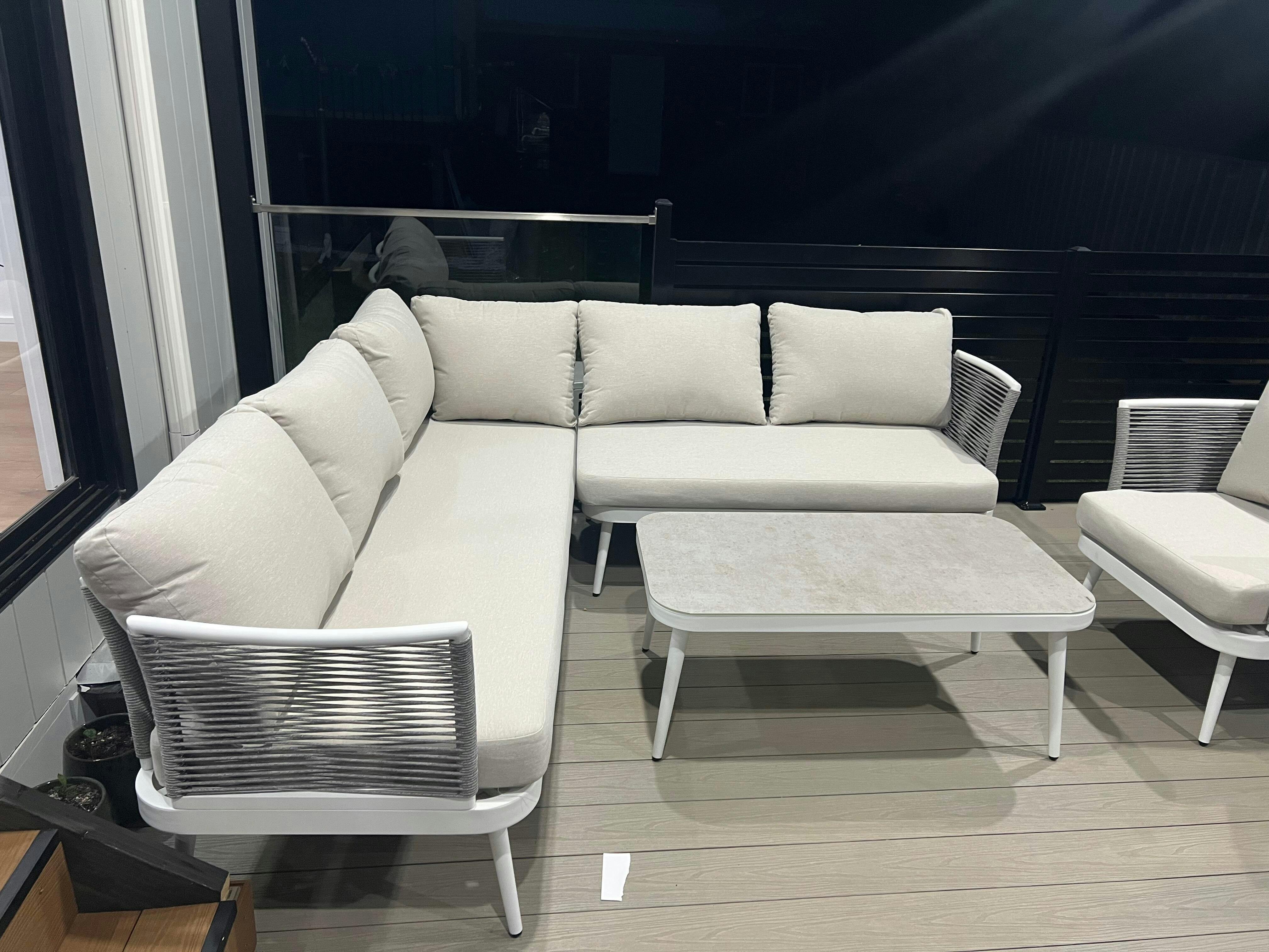 The reinforced aluminium frame gives the setting strong and steady structure. Filled with high density foam, the back and seat cushions provide the type of support and flexibility only premium products possess. Given its stability and reliability, the setting is incredibly dark weight.