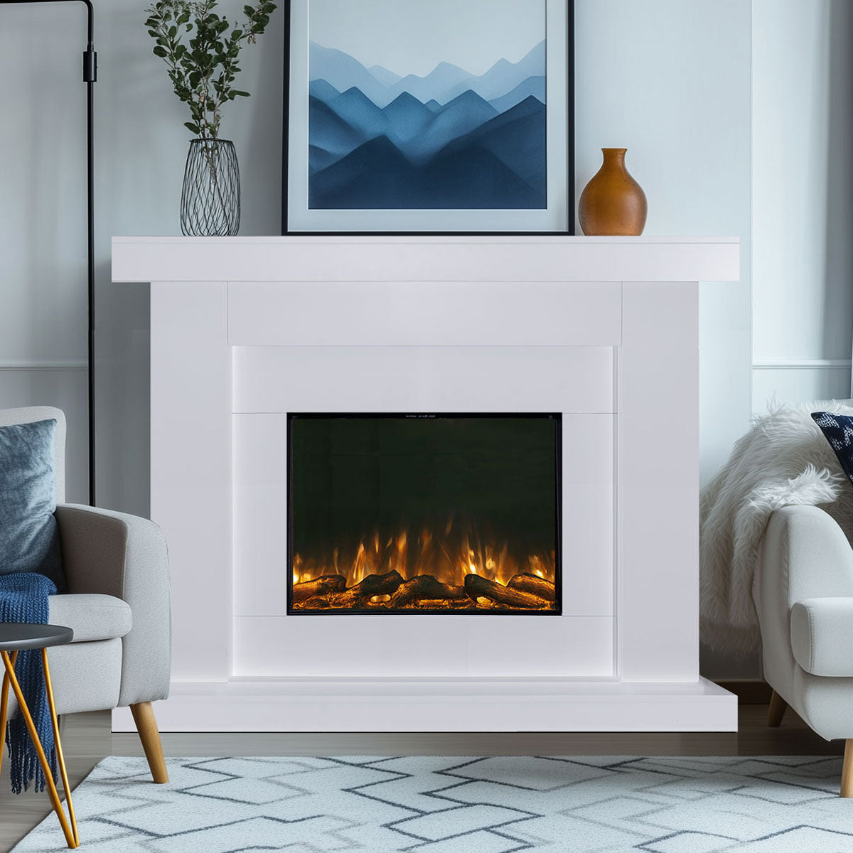 Elevate your living space with the Aristo Electric Fireplace Suite, where timeless white mantel design meets cutting-edge technology. This stunning suite features customizable ambient lighting, 6 flame colors, and 11 fuel bed options, creating the perfect atmosphere for any occasion. The powerful 1500W heater and realistic 3D flame effects deliver both warmth and ambiance, while the easy-to-use remote control and smart features ensure ultimate convenience. Requiring no venting or fuel, this energy-efficient fireplace suite combines classic elegance with modern innovation to transform your home.