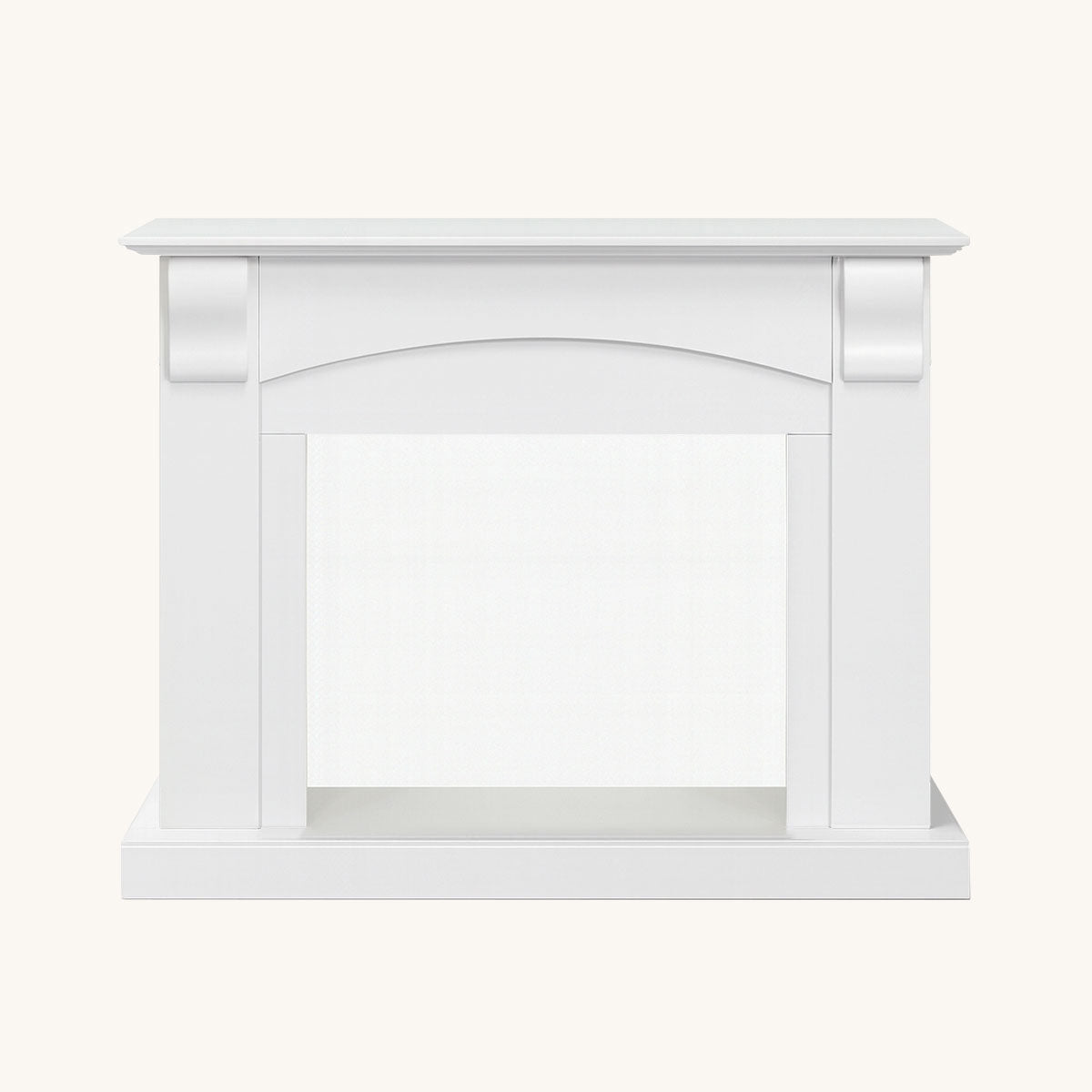 Elegant white mantel with realistic flames, adjustable brightness, crackling sound, dual heat settings, and remote or app control for warmth and ambiance.
