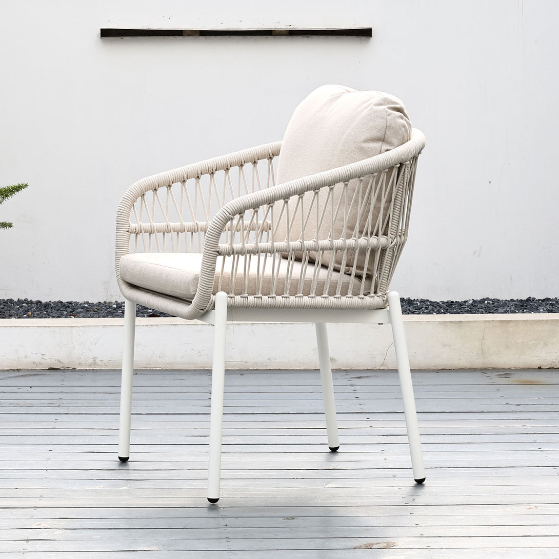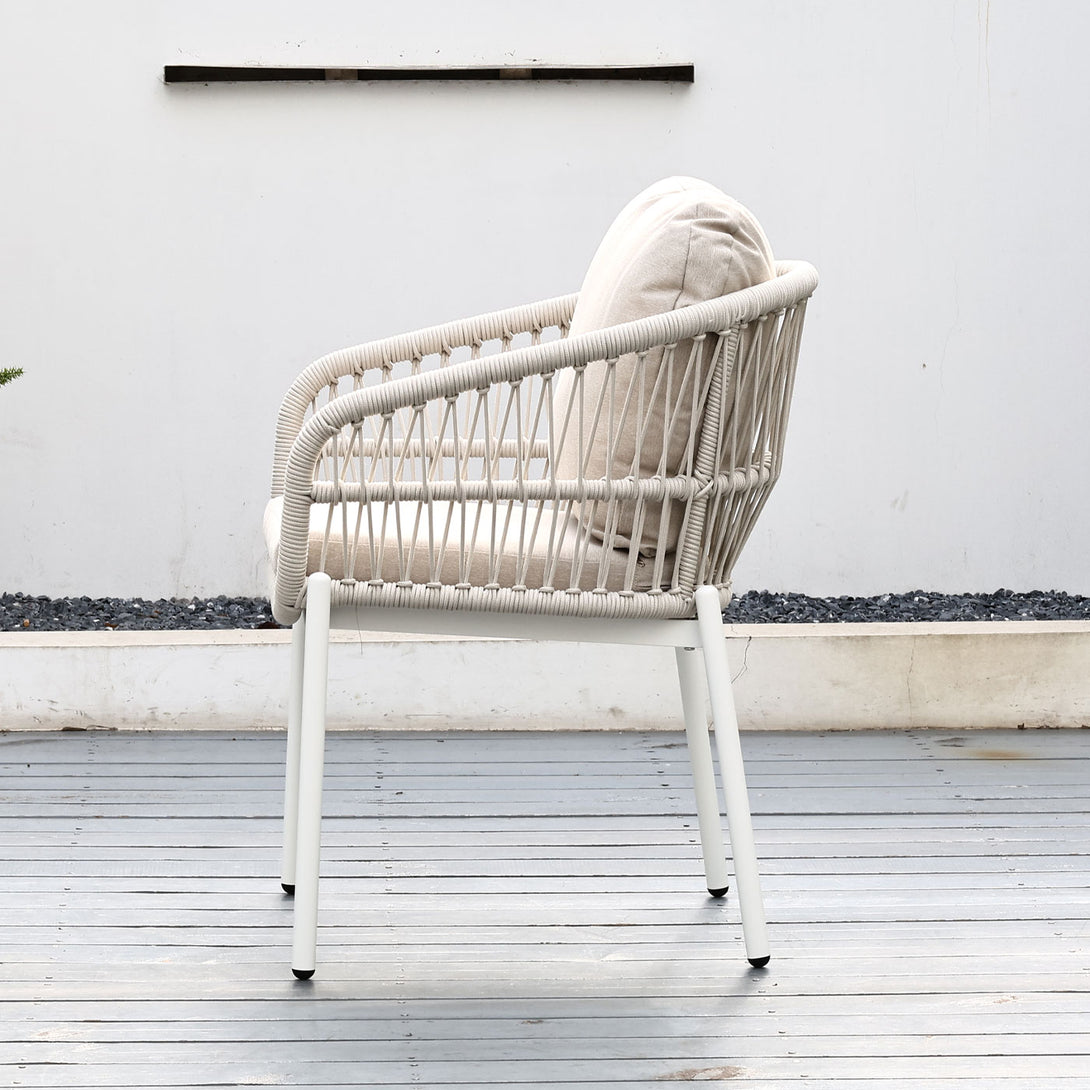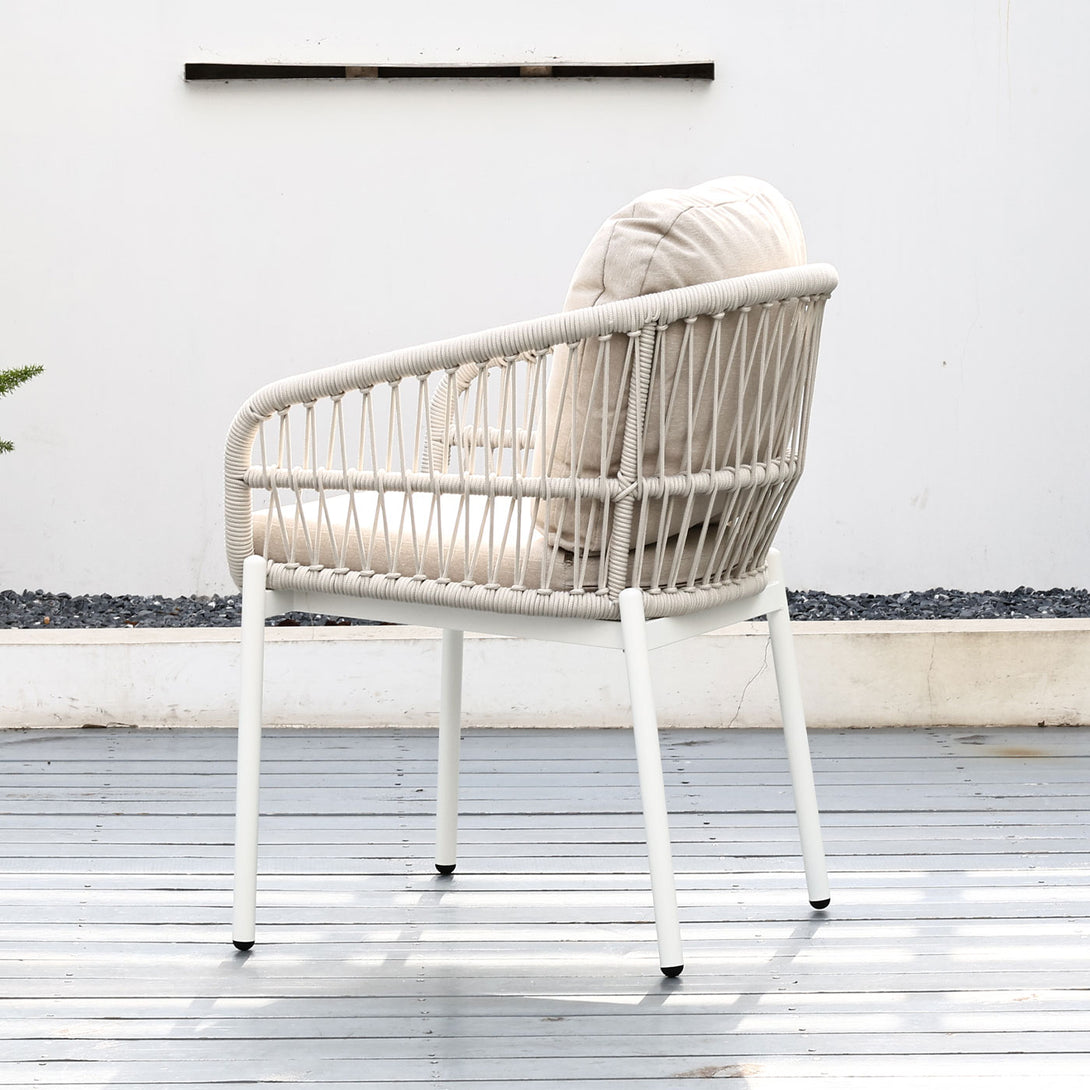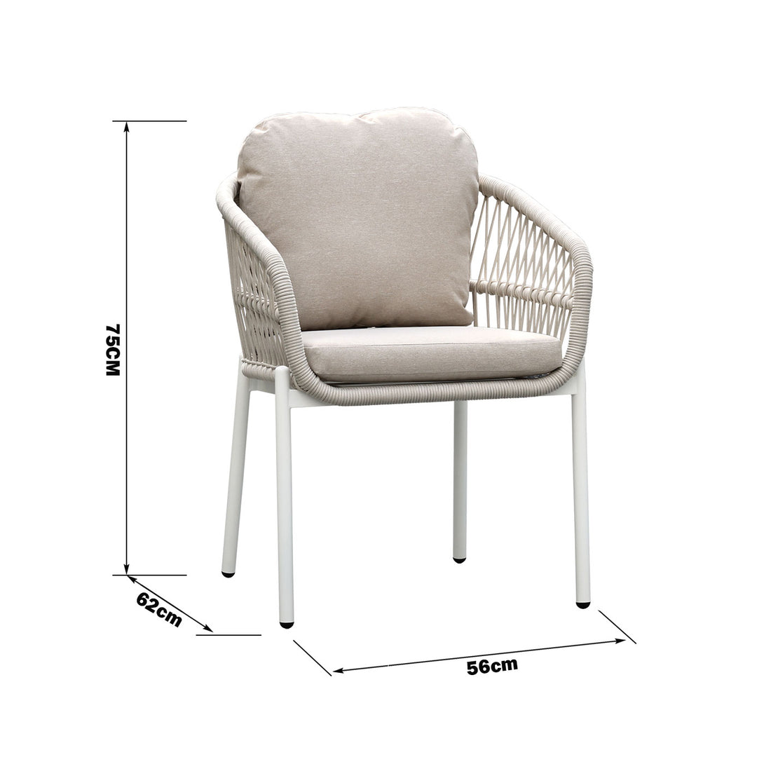 Bali White Aluminium Outdoor Dining Chairs with Arms – Beige Rope and Cushion (Set of 4)