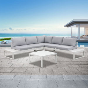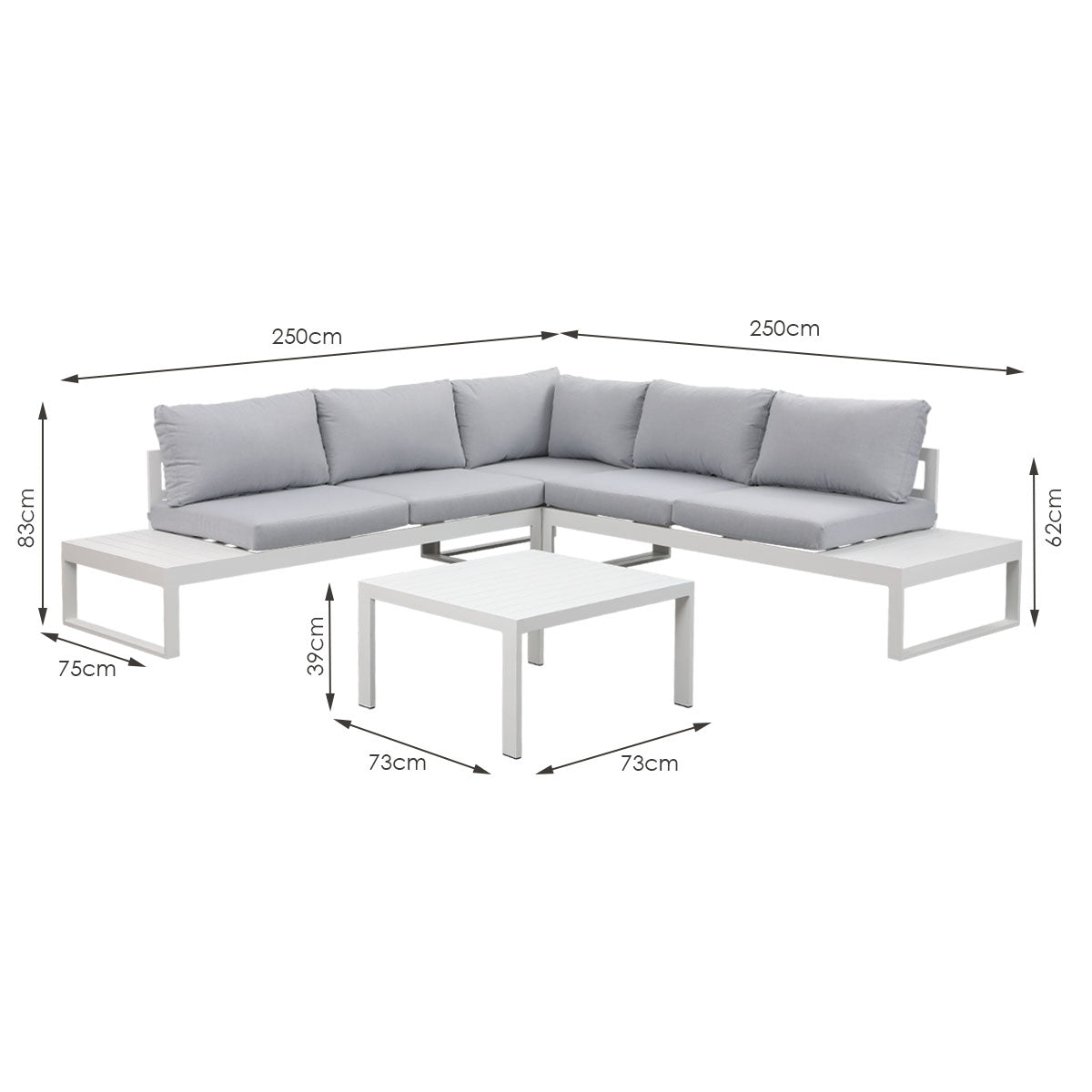 Elegant and sophisticated, the Hampton outdoor lounge set stands out as a quintessential addition to any Australian deck or patio. Designed for the contemporary backyard, this set provides a touch of modern flair, making it the go-to spot for all your gatherings. It consists of one corner seater sofa and two 2-seater sofas, together accommodating up to 5 people in utmost comfort. Additionally, the Hampton set is adorned with two extended side tables, perfect for holding your beverages or books, and an independent coffee table that effortlessly merges practicality with style. Its blend of white aluminium and ash grey cushions underscores a chic and modern aesthetic.