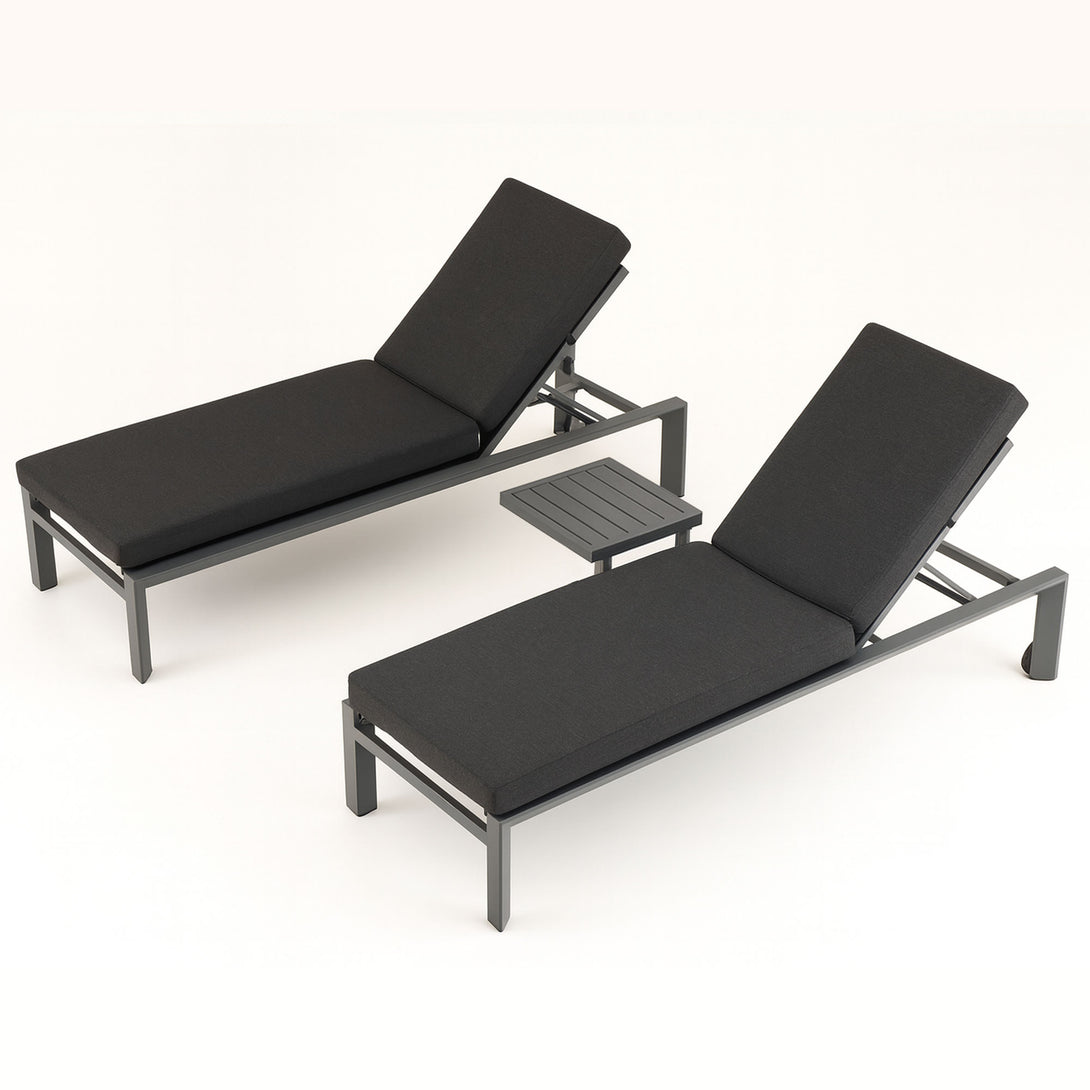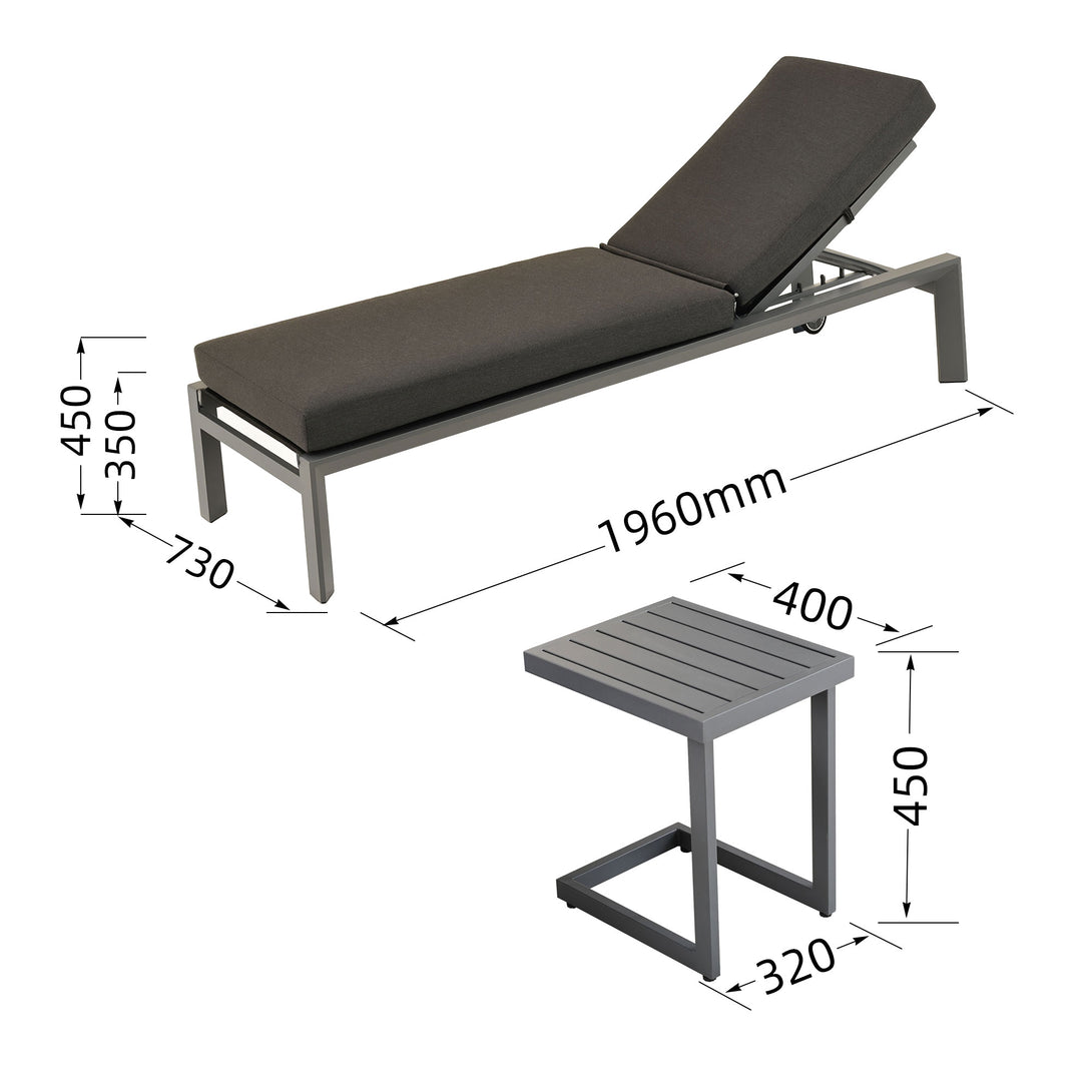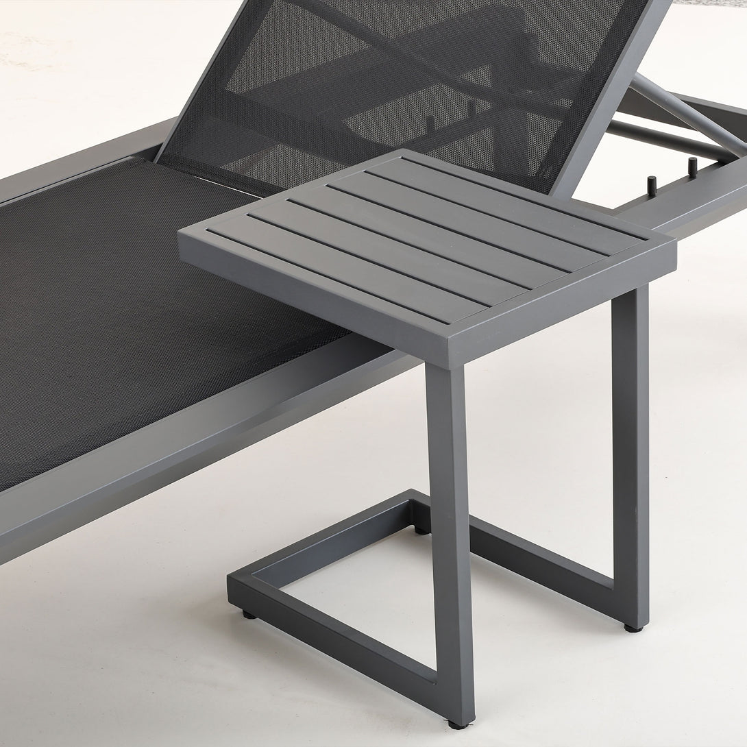 Designed with rear wheels, the loungers can be easily moved to follow the sun or shade. The lightweight side table with a modern slatted top provides a handy space for drinks, books, or sunglasses, keeping your essentials within reach.