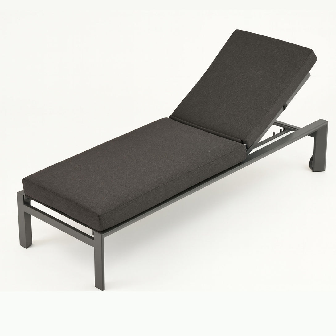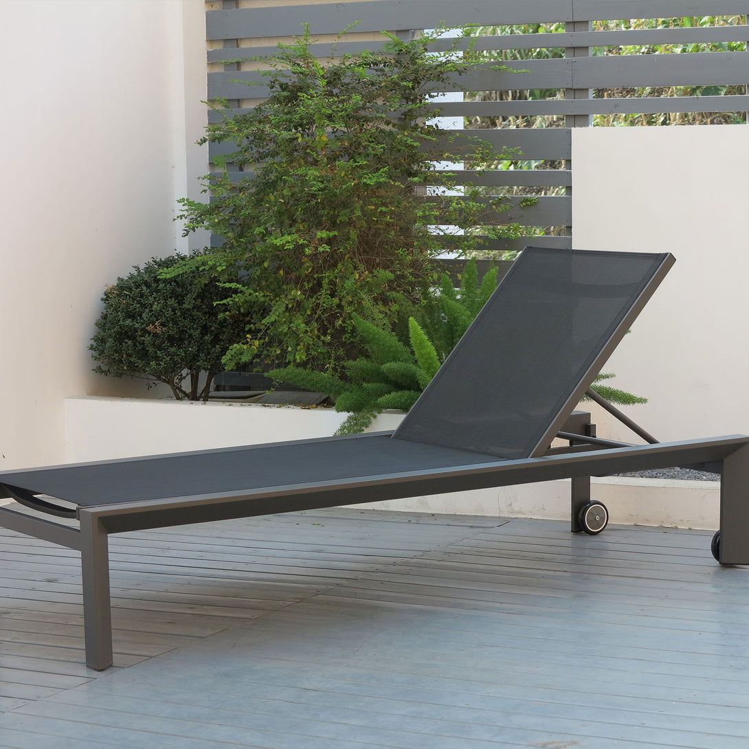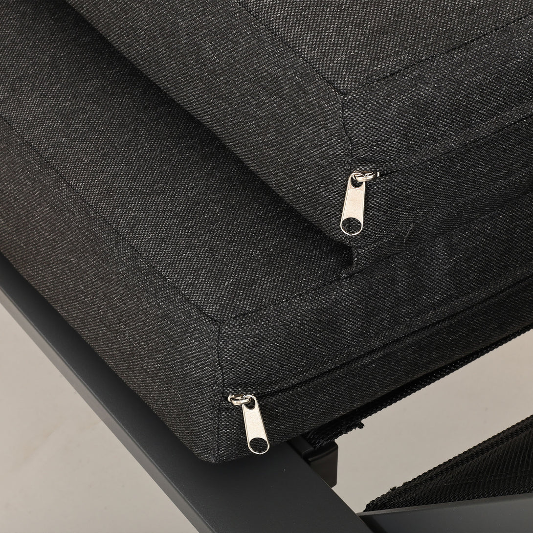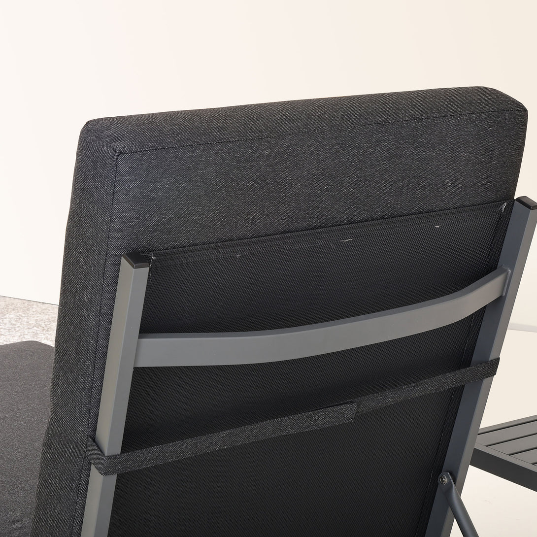 The sleek charcoal powder-coated aluminium frame is completely rust-free, built to withstand harsh outdoor conditions. The base of each lounger is made from Teslin mesh fabric, a premium outdoor material known for its breathability, quick-drying properties, and resistance to fading and mildew - perfect for poolside use.