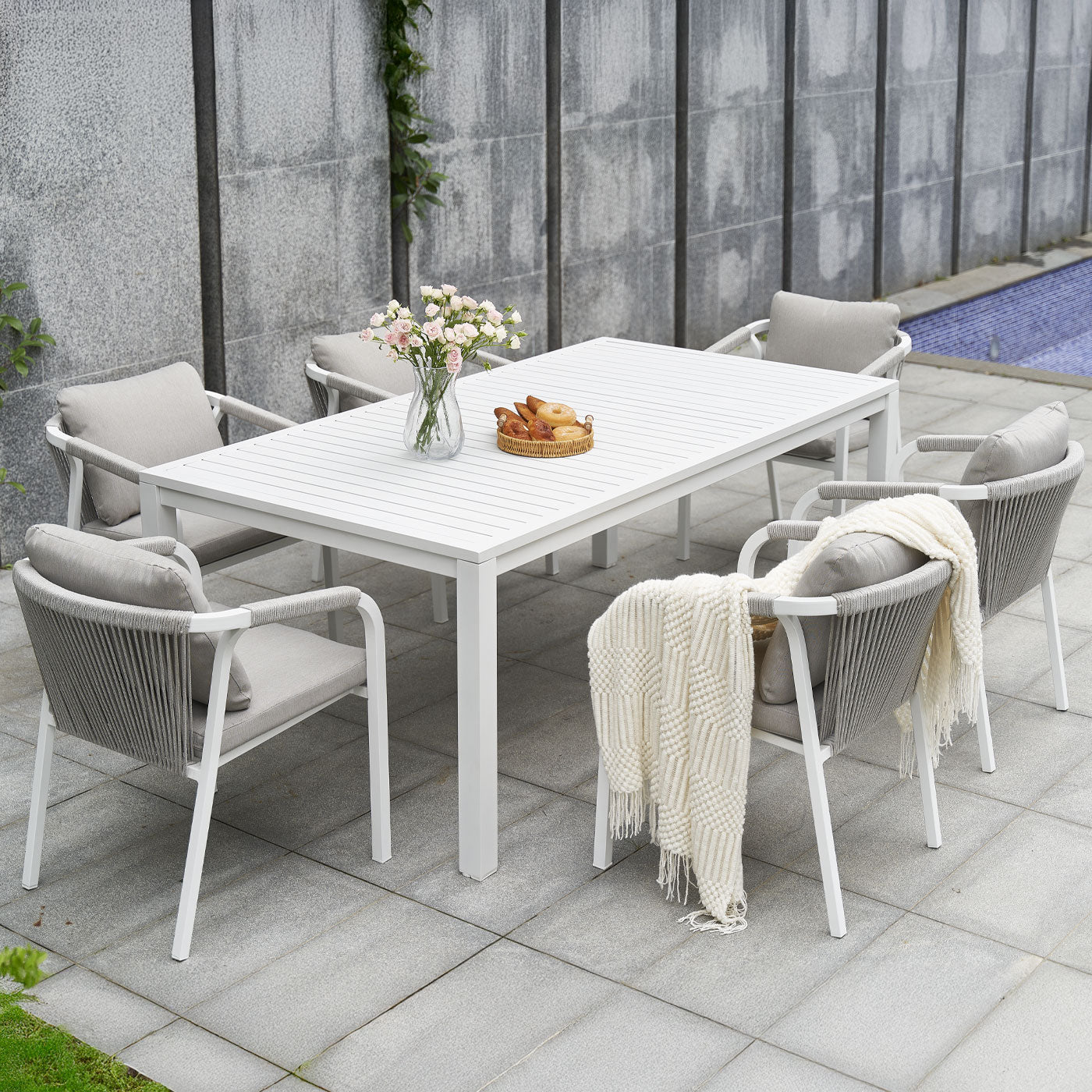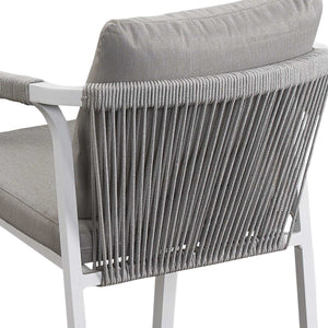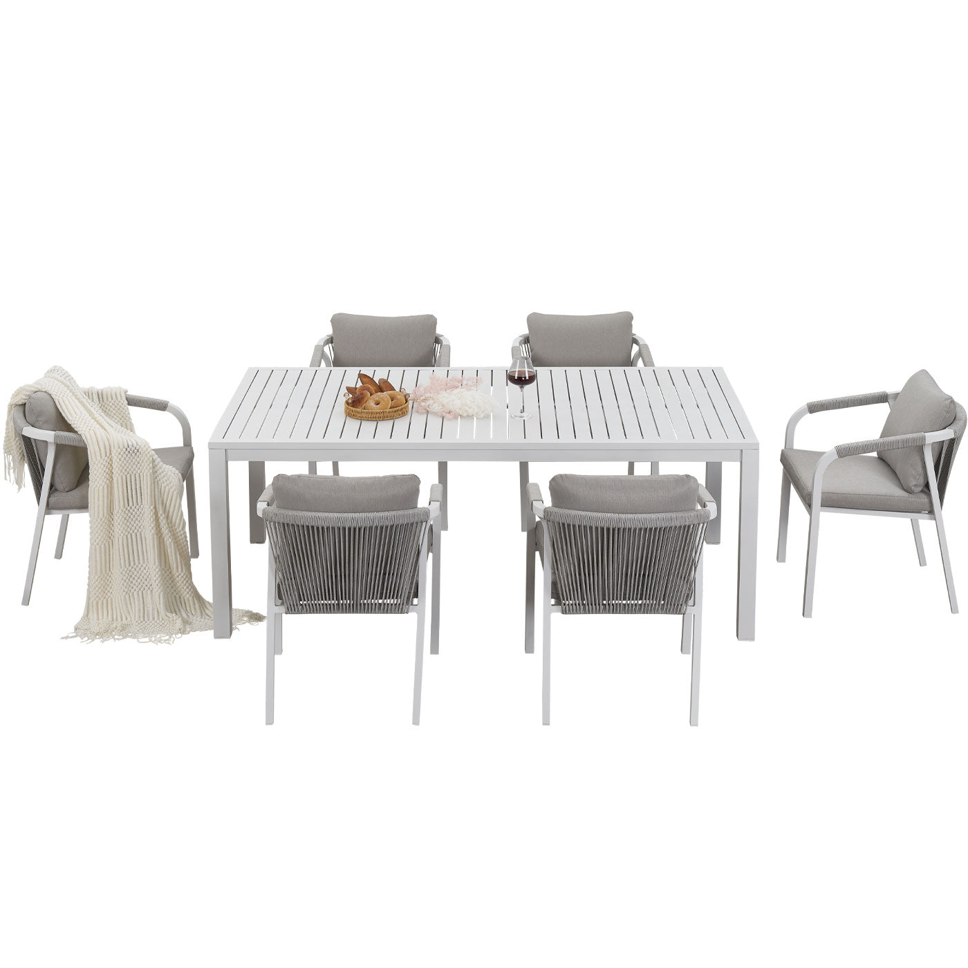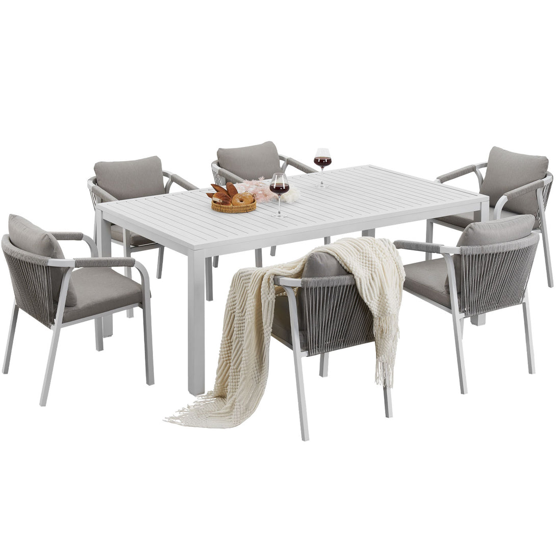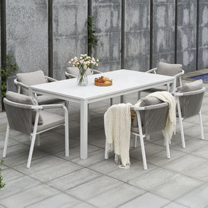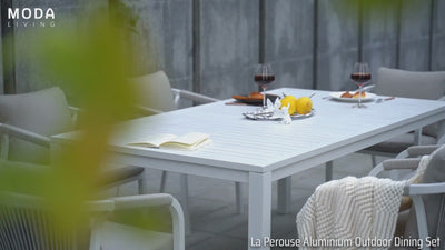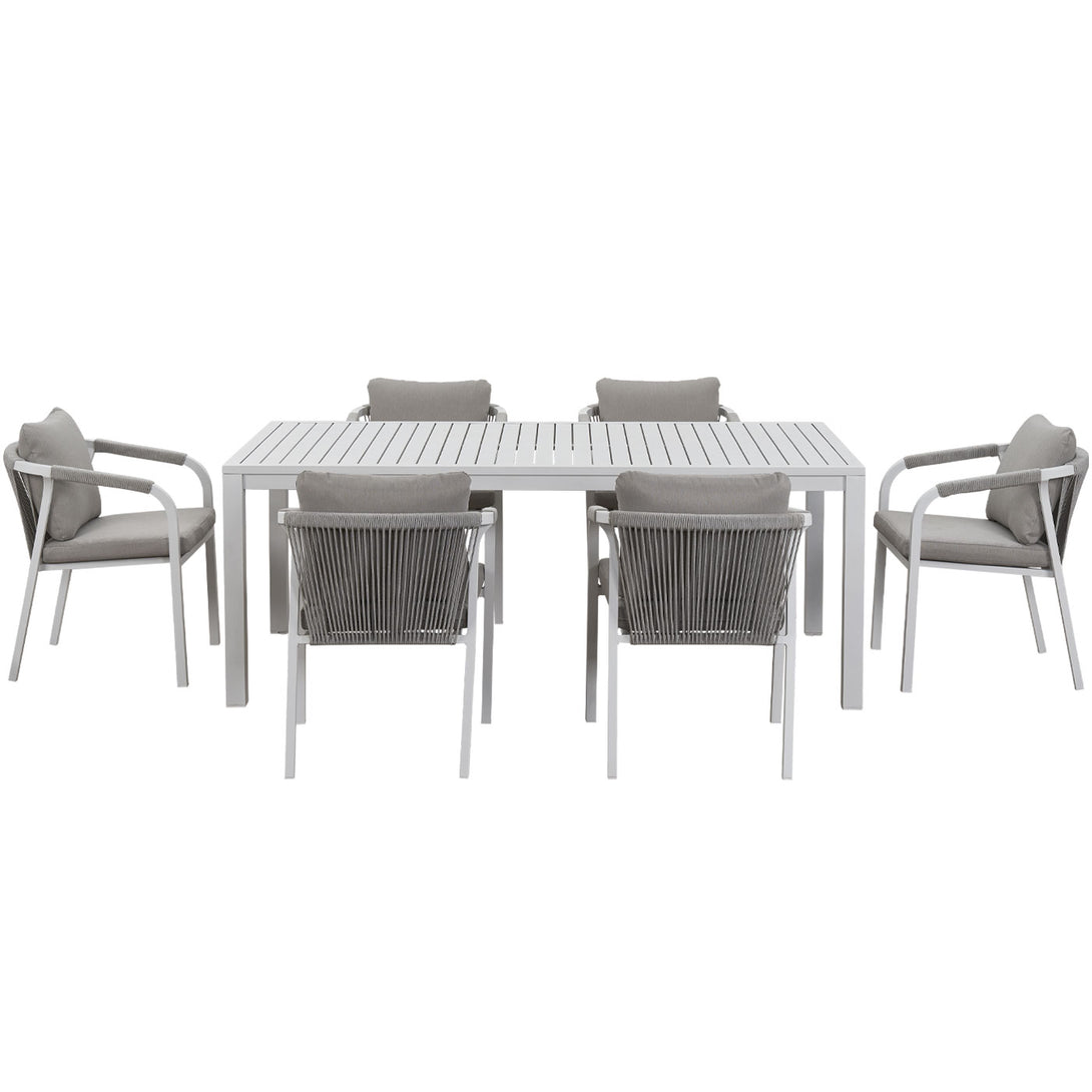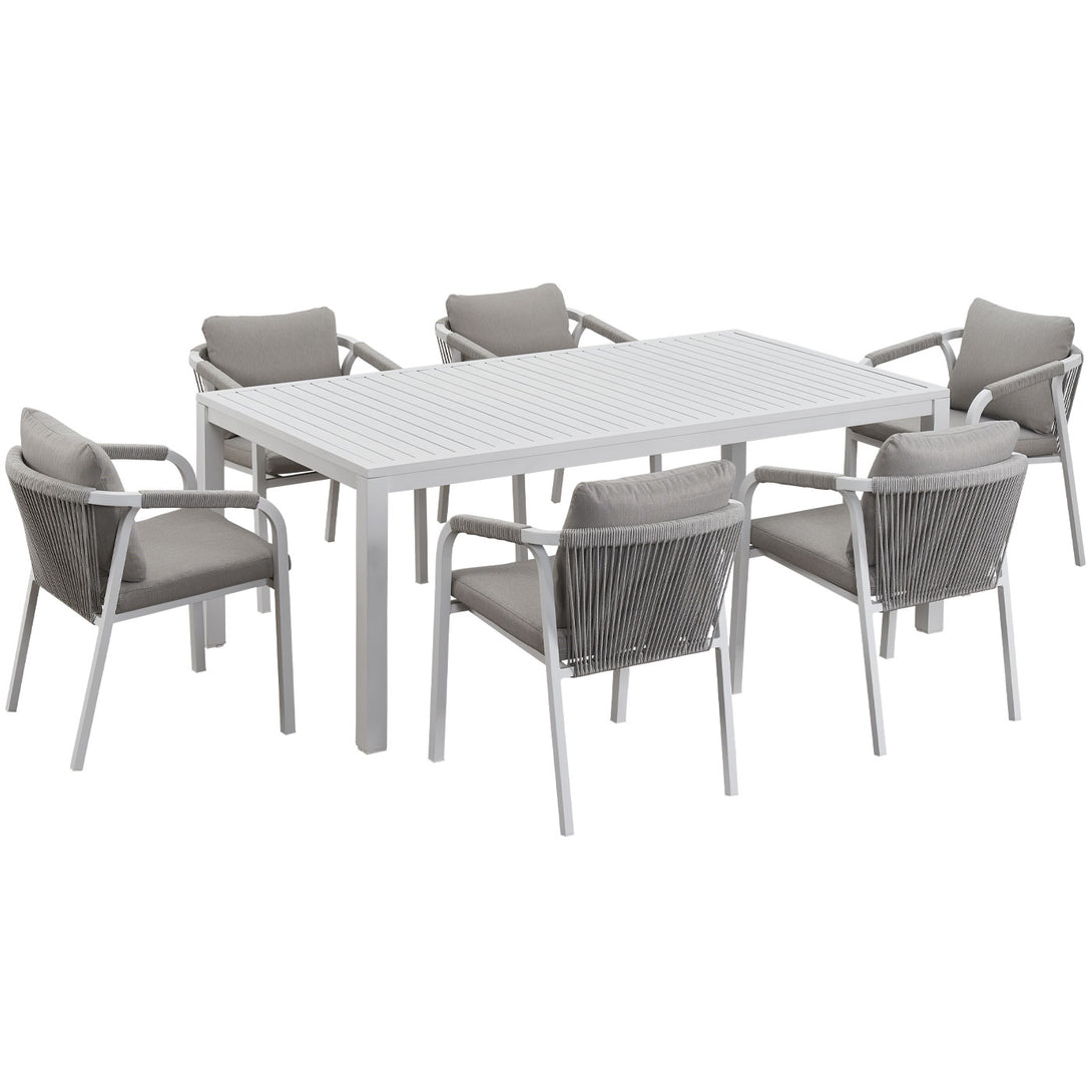 Create a stylish and comfortable alfresco dining area with the La Perouse White Aluminium Outdoor Dining Set. Combining a spacious aluminium slat-top dining table with six matching rope dining chairs, this set brings modern coastal elegance and durable outdoor performance to your patio, garden, or deck.