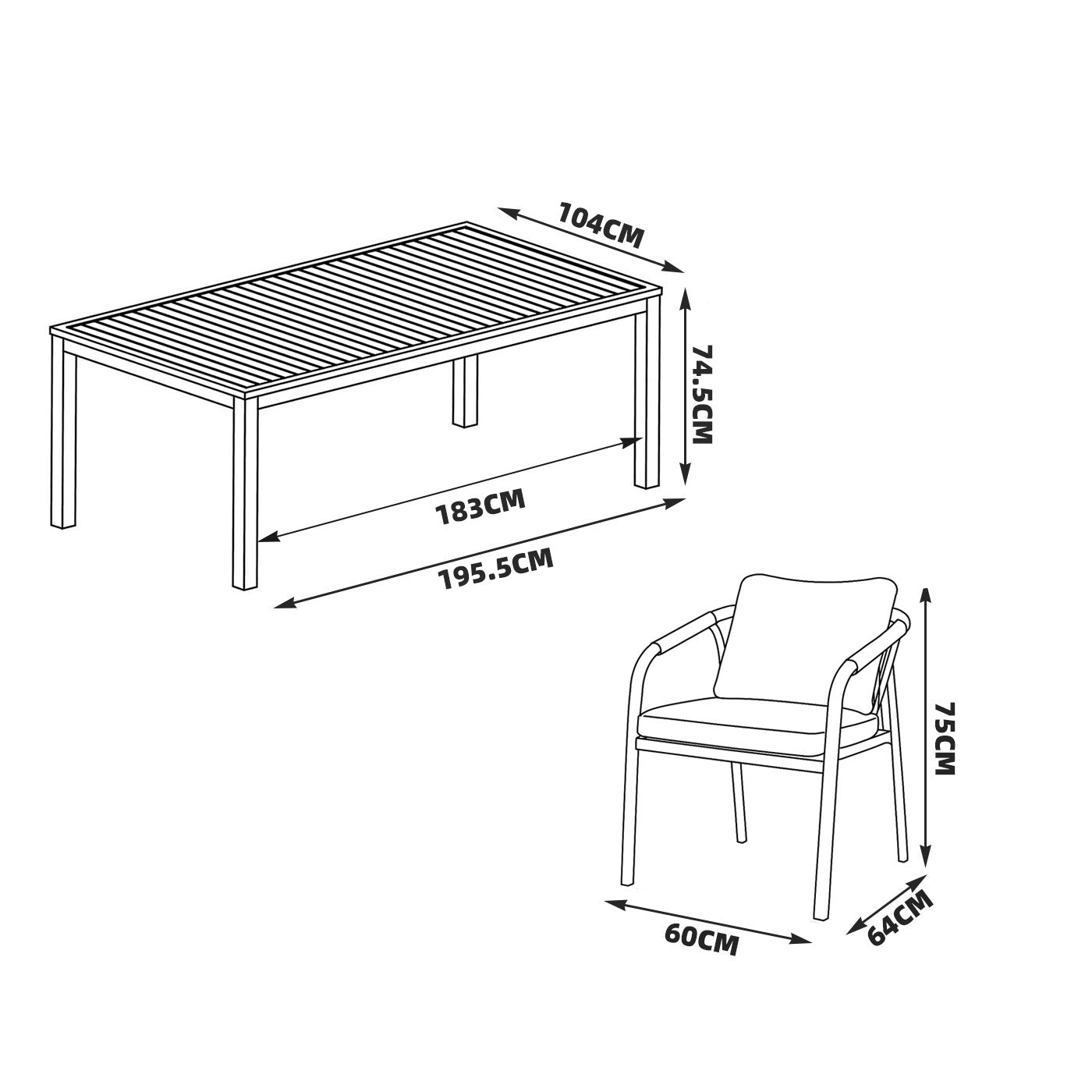 • Table: 195.5 cm (L) x 104 cm (W) x 74.5 cm (H)