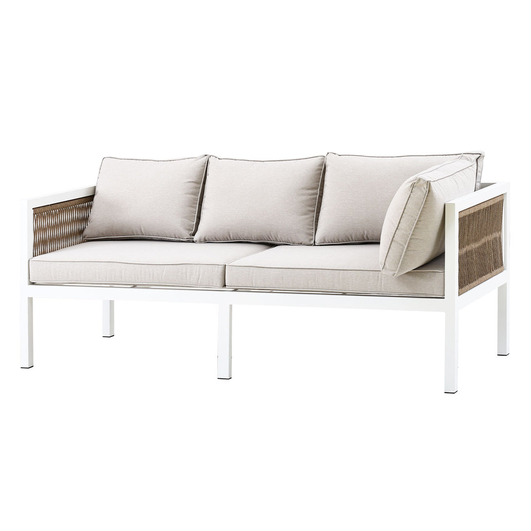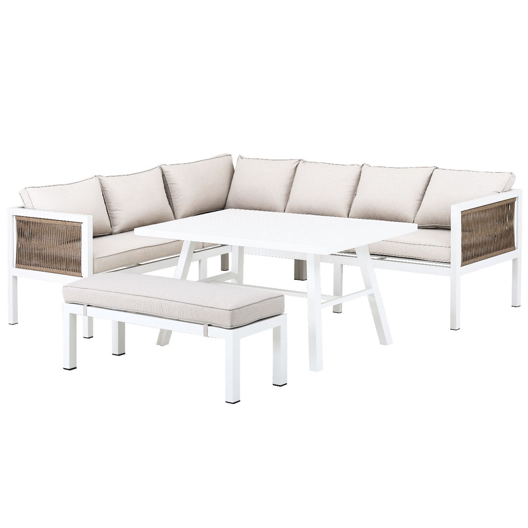 Bright, stylish, and designed for both dining and lounging, the Malibu 2-in-1 Outdoor Lounge Dining Set in White combines a spacious L-shaped sofa with a dining-height table and matching bench. The white powder-coated aluminium frame paired with natural rope-woven armrest panels brings a light coastal elegance, while the aluminium support base ensures long-lasting stability and rust resistance for outdoor use.
