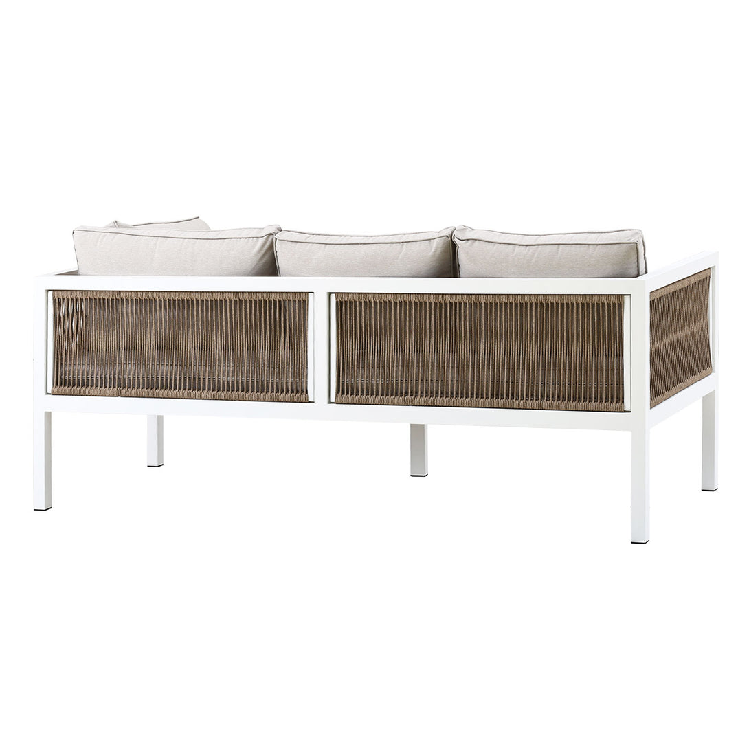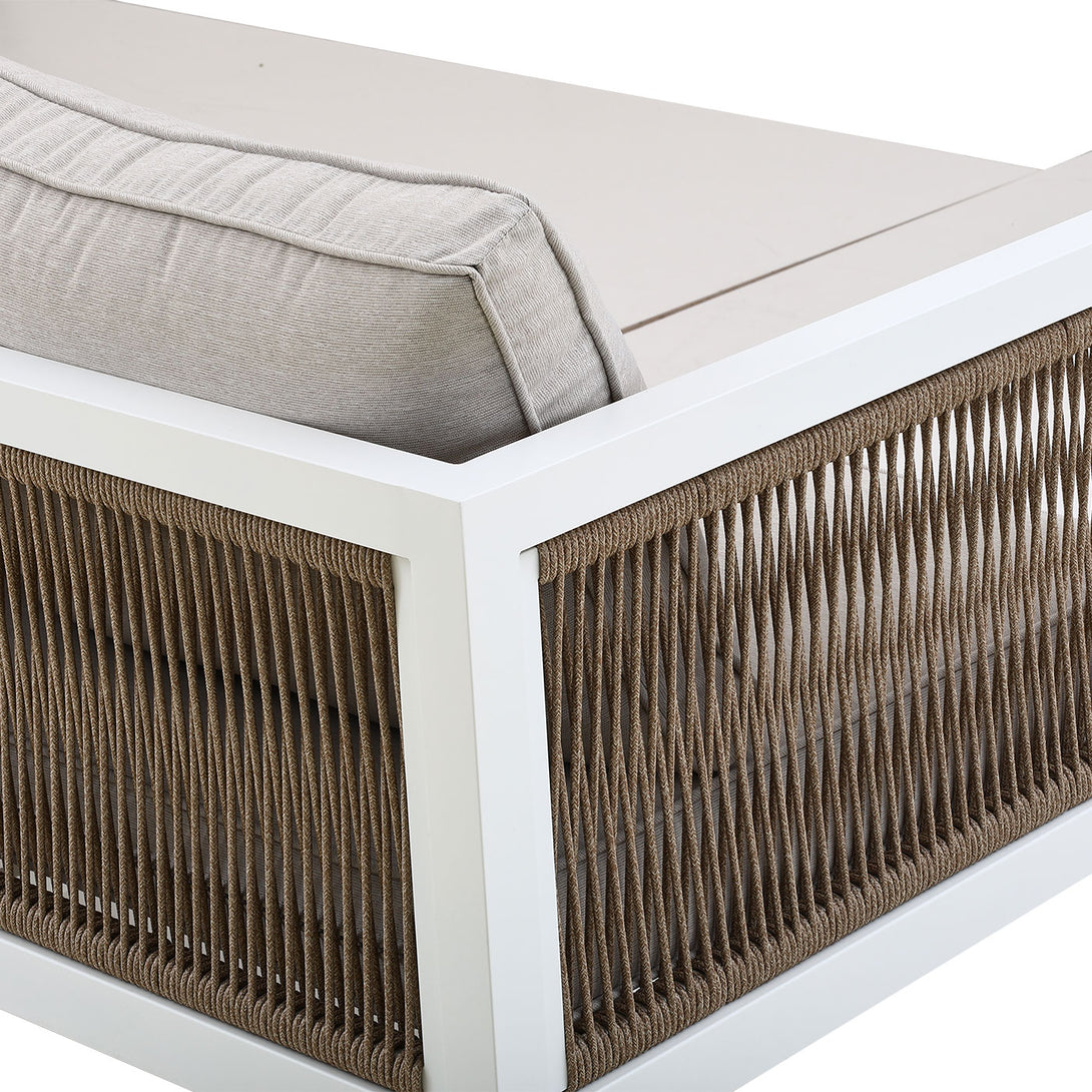 Natural rope weaving on armrests adds warmth and coastal style