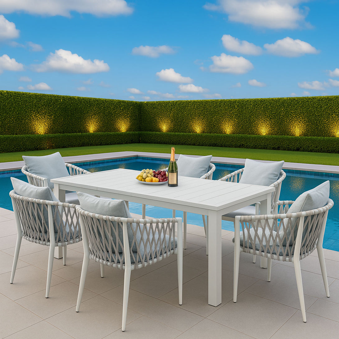 Mornington White Aluminium Outdoor Dining Set - Extension Dining Table and 6 Dining Chairs with Light Grey Cushions