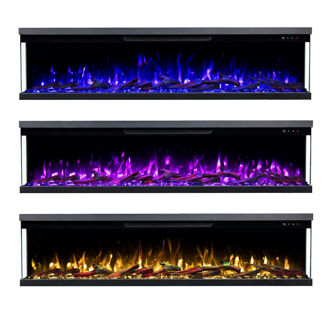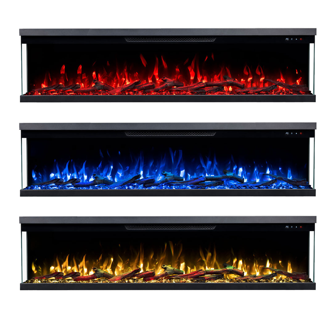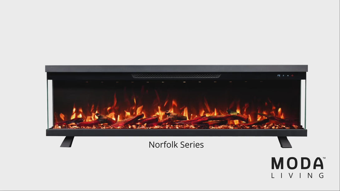 The Norfolk 60 Inch Electric Fireplace features a sleek three-sided glass design with four viewing configurations to perfectly match your space: