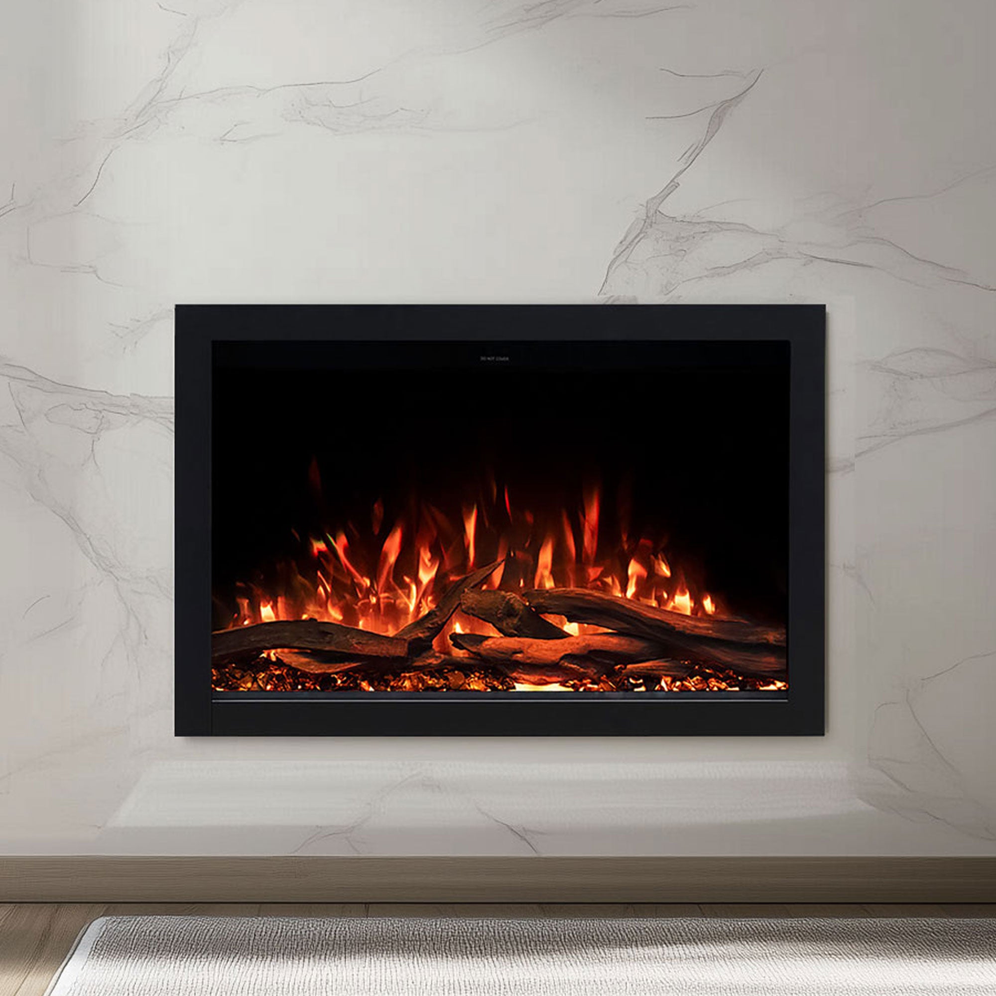 A built-in LED display in the top-right corner of the firebox clearly shows active functions without disrupting the clean, modern interior. The fuel bed features translucent, life-like logs that can be freely arranged, complemented by smoky acrylic crystals underneath that softly glow—mimicking the look of hot embers and ashes with a touch of elegance.