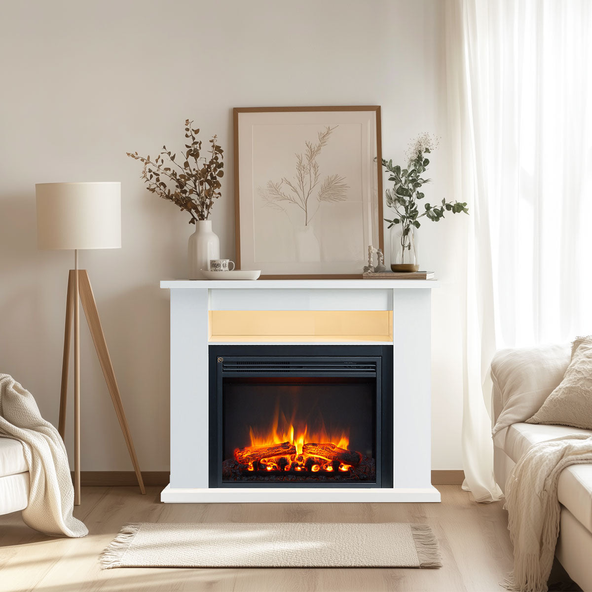 The fireplace uses advanced LED lighting for vivid flames with low energy consumption.
