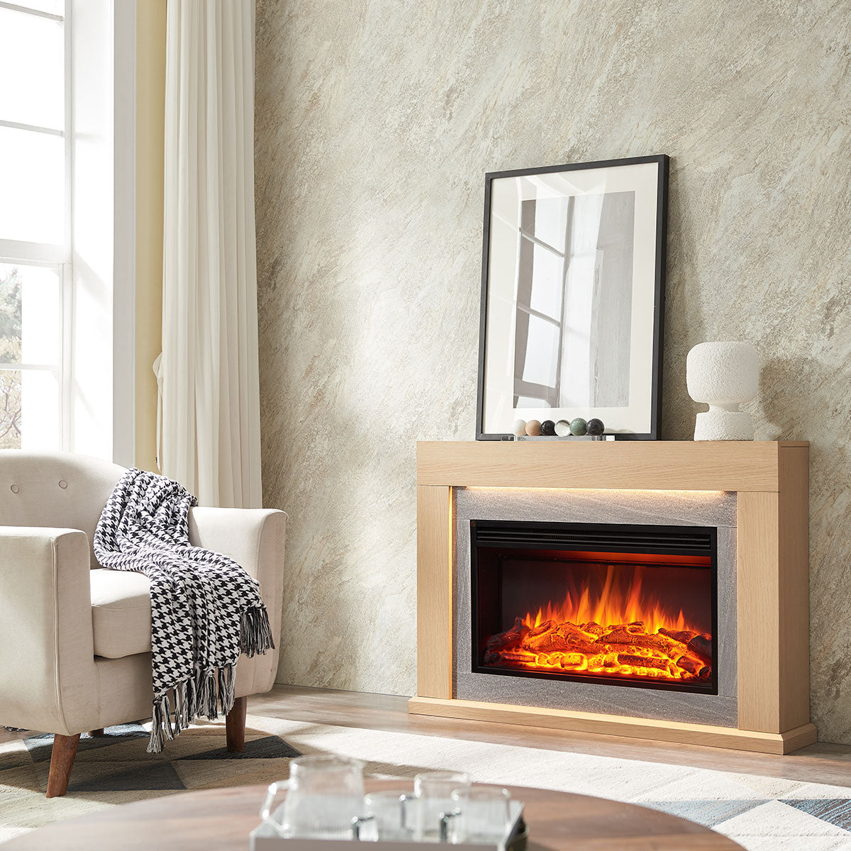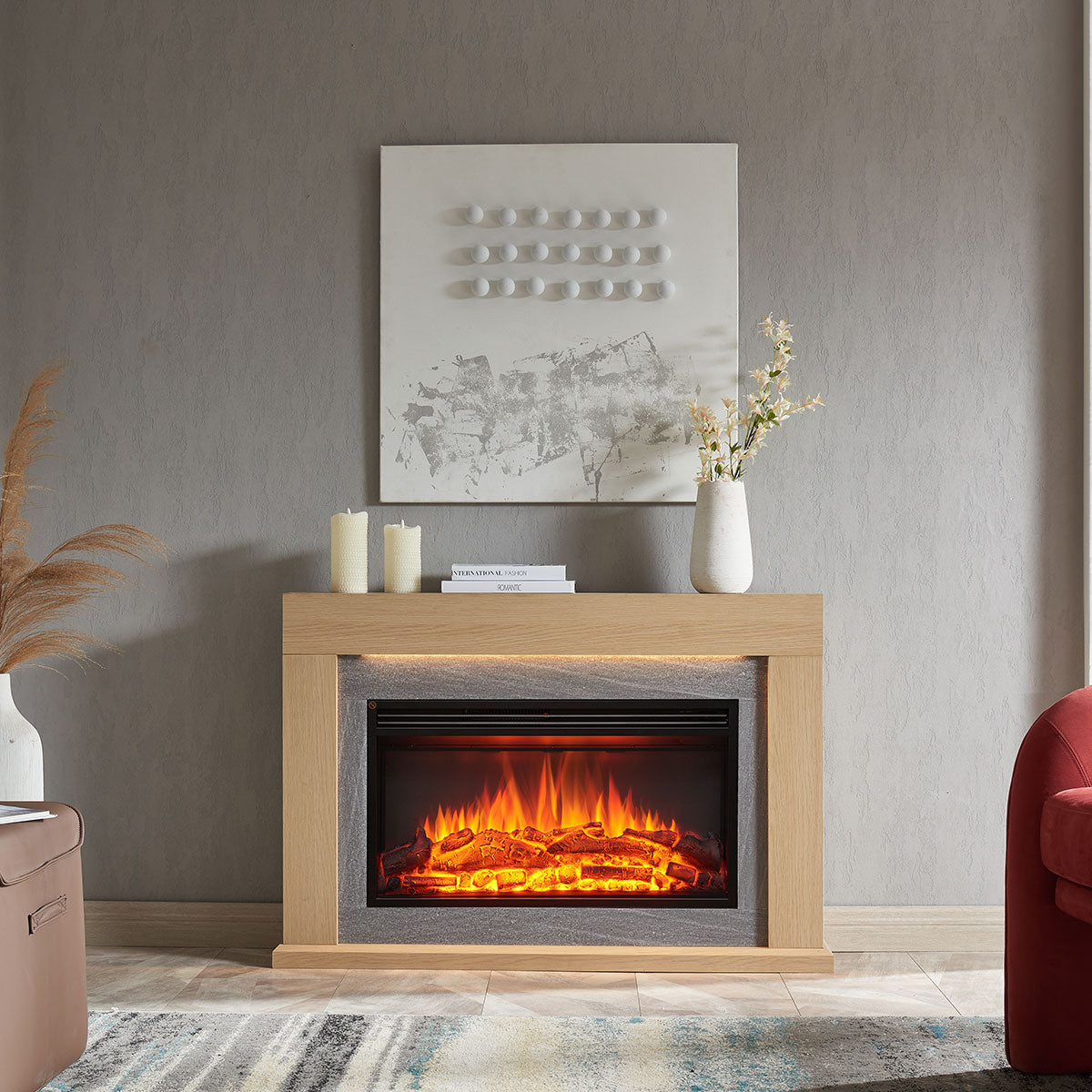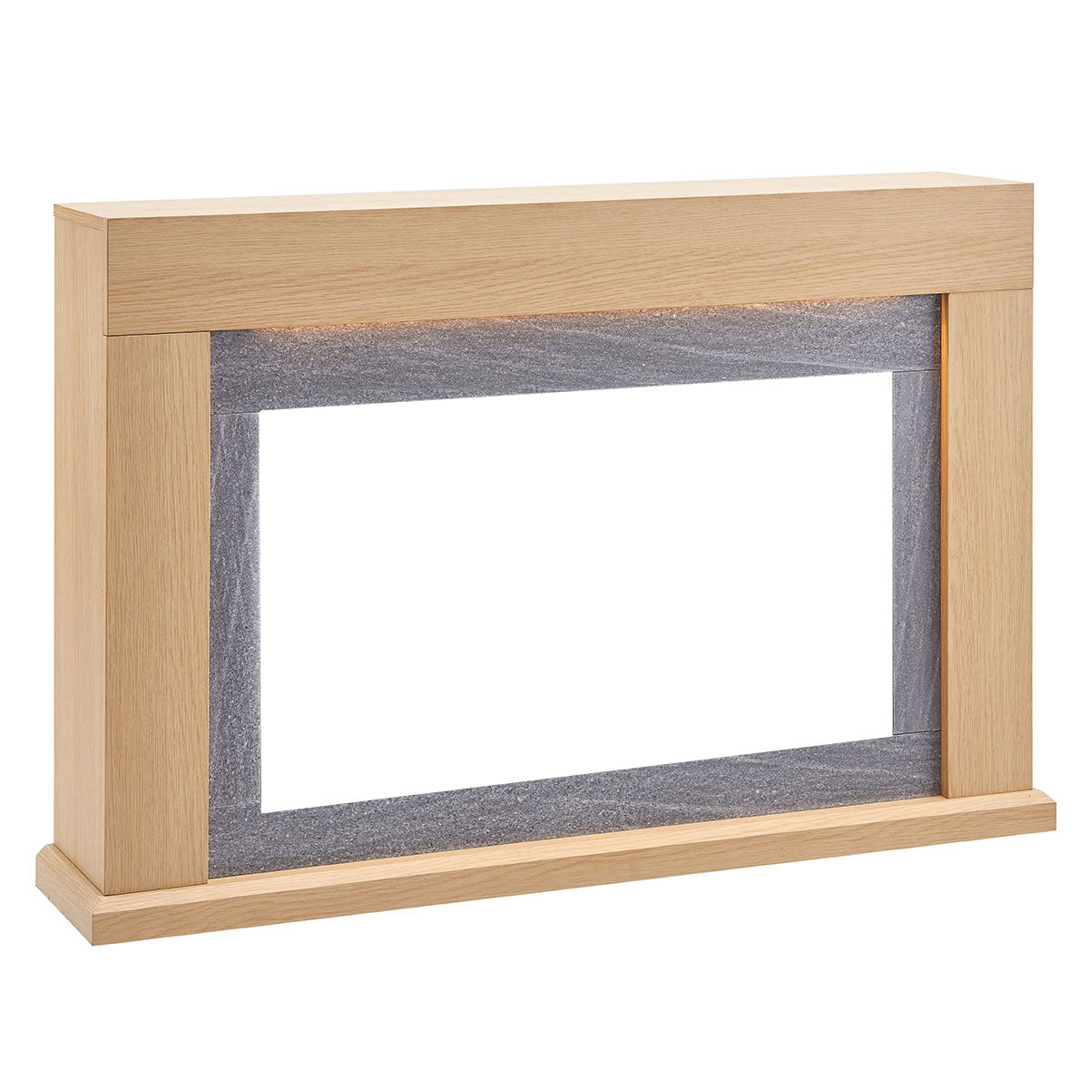 • Elegant Design: The Ruby mantel, finished in Natural Oak with a wood grain texture and veneer finish, features a luxurious marble veneer around the fireplace insert. This sophisticated detail elevates the look and feel of the entire suite, making it a stylish and functional focal point in any room.