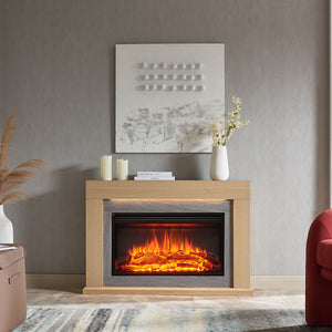This fireplace suite includes the Ruby Mantel in Natural Oak with a luxurious marble veneer around the fireplace insert, and the 30 inch Stella Electric Fireplace Insert. The perfect blend of modern functionality and timeless design, this suite brings warmth, ambiance, and elegance to any room.