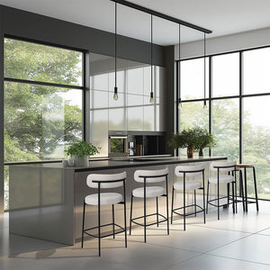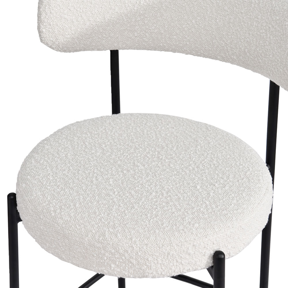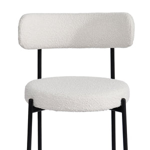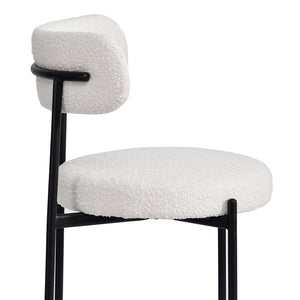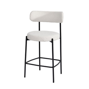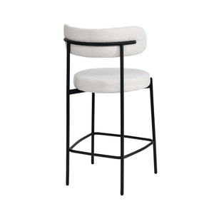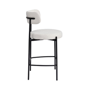 Introducing the Selena Bar Stool, a perfect blend of style and comfort. Crafted with light beige boucle fabric and sleek black metal legs, this bar stool is designed to elevate your bar or kitchen area. The gracefully curved backrest is designed to perfectly contour your back, providing excellent support and enhancing your sitting experience. The round seat cushion ensures that you can sit comfortably in any direction, making this stool as versatile as it is elegant. The contrasting black metal frame adds a modern touch, complementing the soft texture of the boucle fabric.